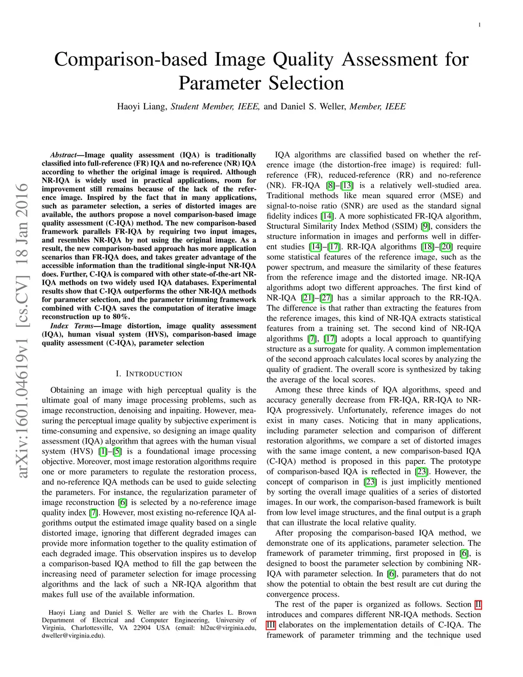 Image quality assessment (IQA) is traditionally classified into full-reference (FR) IQA and no-reference (NR) IQA according to whether the original image is required. Although NR-IQA is widely used in practical applications, room for improvement still remains because of the lack of the reference image. Inspired by the fact that in many applications, such as parameter selection, a series of distorted images are available, the authors propose a novel comparison-based image quality assessment (C-IQA) method. The new comparison-based framework parallels FR-IQA by requiring two input images, and resembles NR-IQA by not using the original image. As a result, the new comparison-based approach has more application scenarios than FR-IQA does, and takes greater advantage of the accessible information than the traditional single-input NR-IQA does. Further, C-IQA is compared with other state-of-the-art NR-IQA methods on two widely used IQA databases. Experimental results show that C-IQA outperforms the other NR-IQA methods for parameter selection, and the parameter trimming framework combined with C-IQA saves the computation of iterative image reconstruction up to 80%.