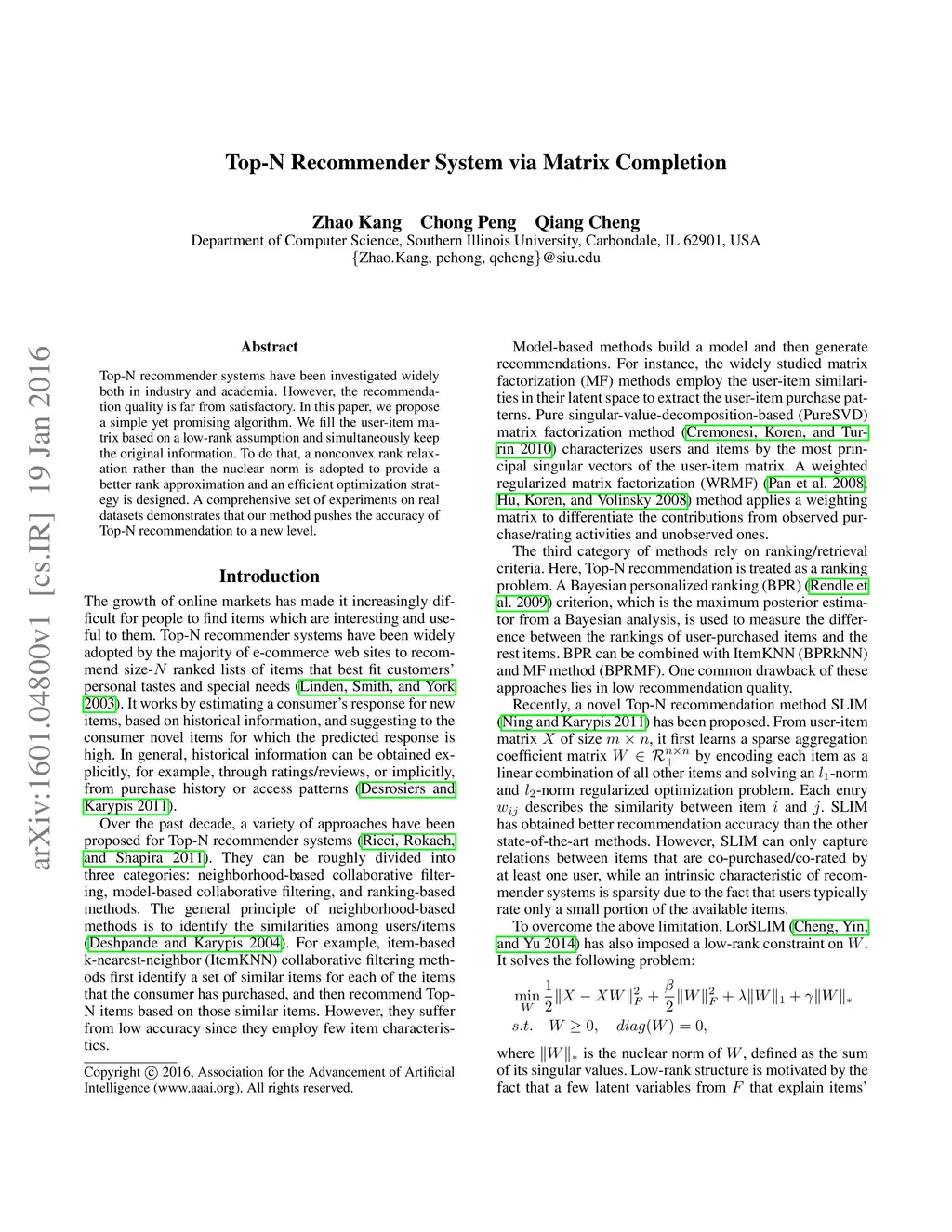 Top-N recommender systems have been investigated widely both in industry and academia. However, the recommendation quality is far from satisfactory. In this paper, we propose a simple yet promising algorithm. We fill the user-item matrix based on a low-rank assumption and simultaneously keep the original information. To do that, a nonconvex rank relaxation rather than the nuclear norm is adopted to provide a better rank approximation and an efficient optimization strategy is designed. A comprehensive set of experiments on real datasets demonstrates that our method pushes the accuracy of Top-N recommendation to a new level.