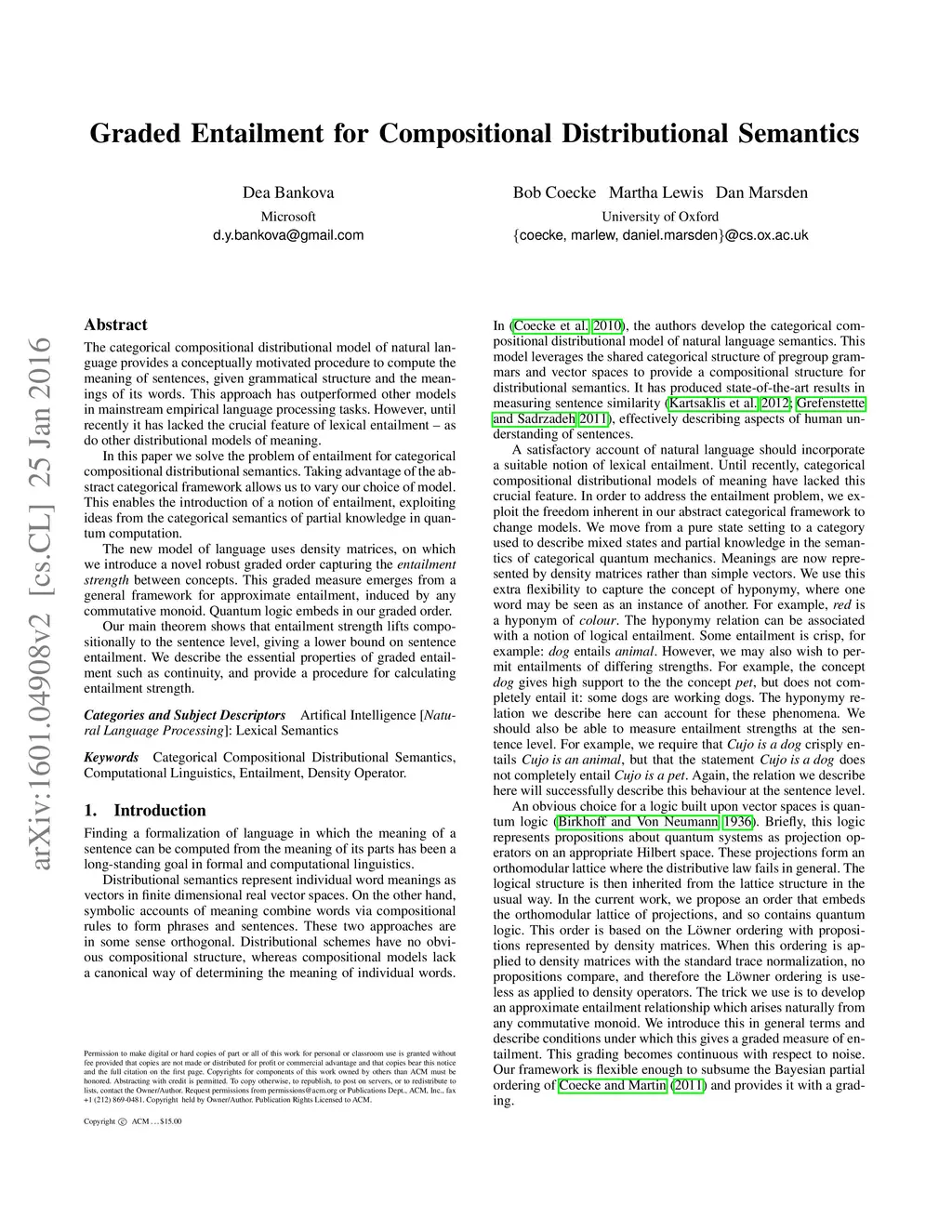 The categorical compositional distributional model of natural language provides a conceptually motivated procedure to compute the meaning of sentences, given grammatical structure and the meanings of its words. This approach has outperformed other models in mainstream empirical language processing tasks. However, until recently it has lacked the crucial feature of lexical entailment -- as do other distributional models of meaning. In this paper we solve the problem of entailment for categorical compositional distributional semantics. Taking advantage of the abstract categorical framework allows us to vary our choice of model. This enables the introduction of a notion of entailment, exploiting ideas from the categorical semantics of partial knowledge in quantum computation. The new model of language uses density matrices, on which we introduce a novel robust graded order capturing the entailment strength between concepts. This graded measure emerges from a general framework for approximate entailment, induced by any commutative monoid. Quantum logic embeds in our graded order. Our main theorem shows that entailment strength lifts compositionally to the sentence level, giving a lower bound on sentence entailment. We describe the essential properties of graded entailment such as continuity, and provide a procedure for calculating entailment strength.