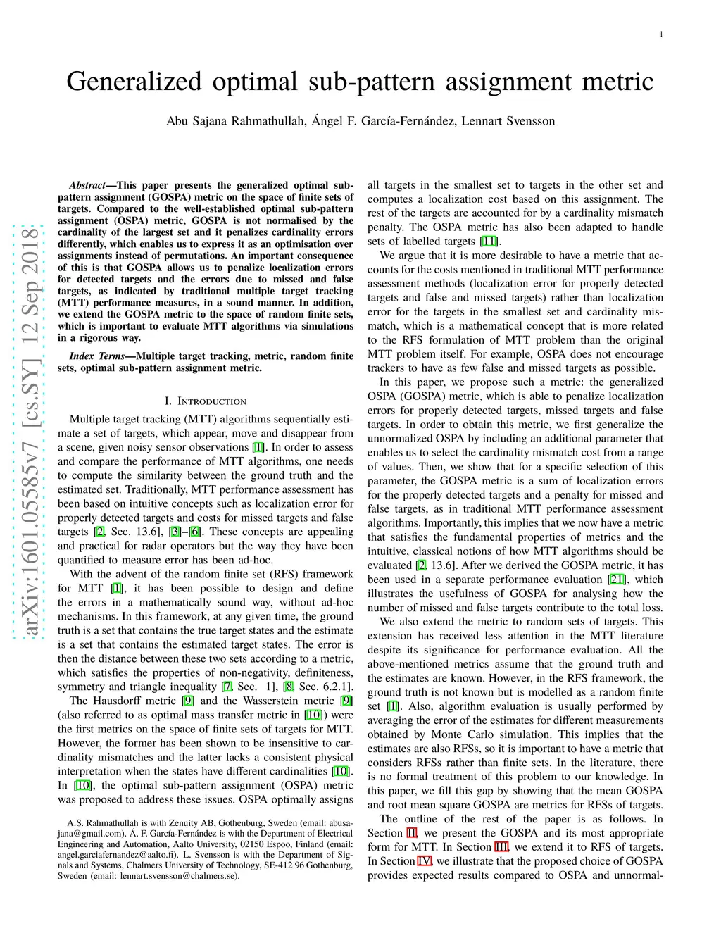 This paper presents the generalized optimal sub-pattern assignment (GOSPA) metric on the space of finite sets of targets. Compared to the well-established optimal sub-pattern assignment (OSPA) metric, GOSPA is unnormalized as a function of the cardinality and it penalizes cardinality errors differently, which enables us to express it as an optimisation over assignments instead of permutations. An important consequence of this is that GOSPA allows us to penalize localization errors for detected targets and the errors due to missed and false targets, as indicated by traditional multiple target tracking (MTT) performance measures, in a sound manner. In addition, we extend the GOSPA metric to the space of random finite sets, which is important to evaluate MTT algorithms via simulations in a rigorous way.