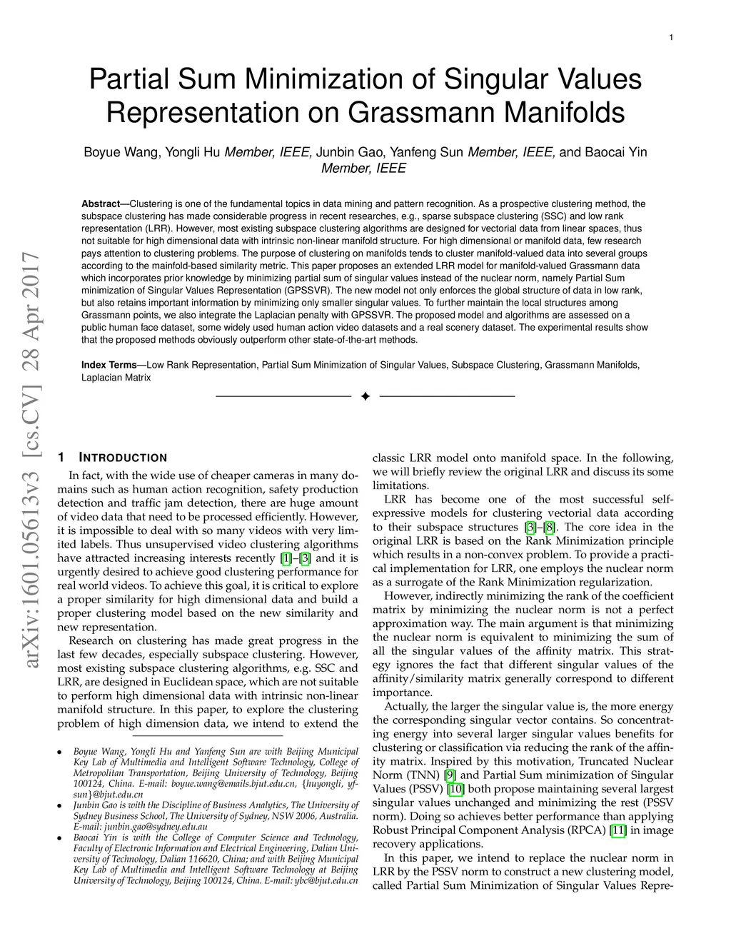 As a significant subspace clustering method, low rank representation (LRR) has attracted great attention in recent years. To further improve the performance of LRR and extend its applications, there are several issues to be resolved. The nuclear norm in LRR does not sufficiently use the prior knowledge of the rank which is known in many practical problems. The LRR is designed for vectorial data from linear spaces, thus not suitable for high dimensional data with intrinsic non-linear manifold structure. This paper proposes an extended LRR model for manifold-valued Grassmann data which incorporates prior knowledge by minimizing partial sum of singular values instead of the nuclear norm, namely Partial Sum minimization of Singular Values Representation (GPSSVR). The new model not only enforces the global structure of data in low rank, but also retains important information by minimizing only smaller singular values. To further maintain the local structures among Grassmann points, we also integrate the Laplacian penalty with GPSSVR. An effective algorithm is proposed to solve the optimization problem based on the GPSSVR model. The proposed model and algorithms are assessed on some widely used human action video datasets and a real scenery dataset. The experimental results show that the proposed methods obviously outperform other state-of-the-art methods.