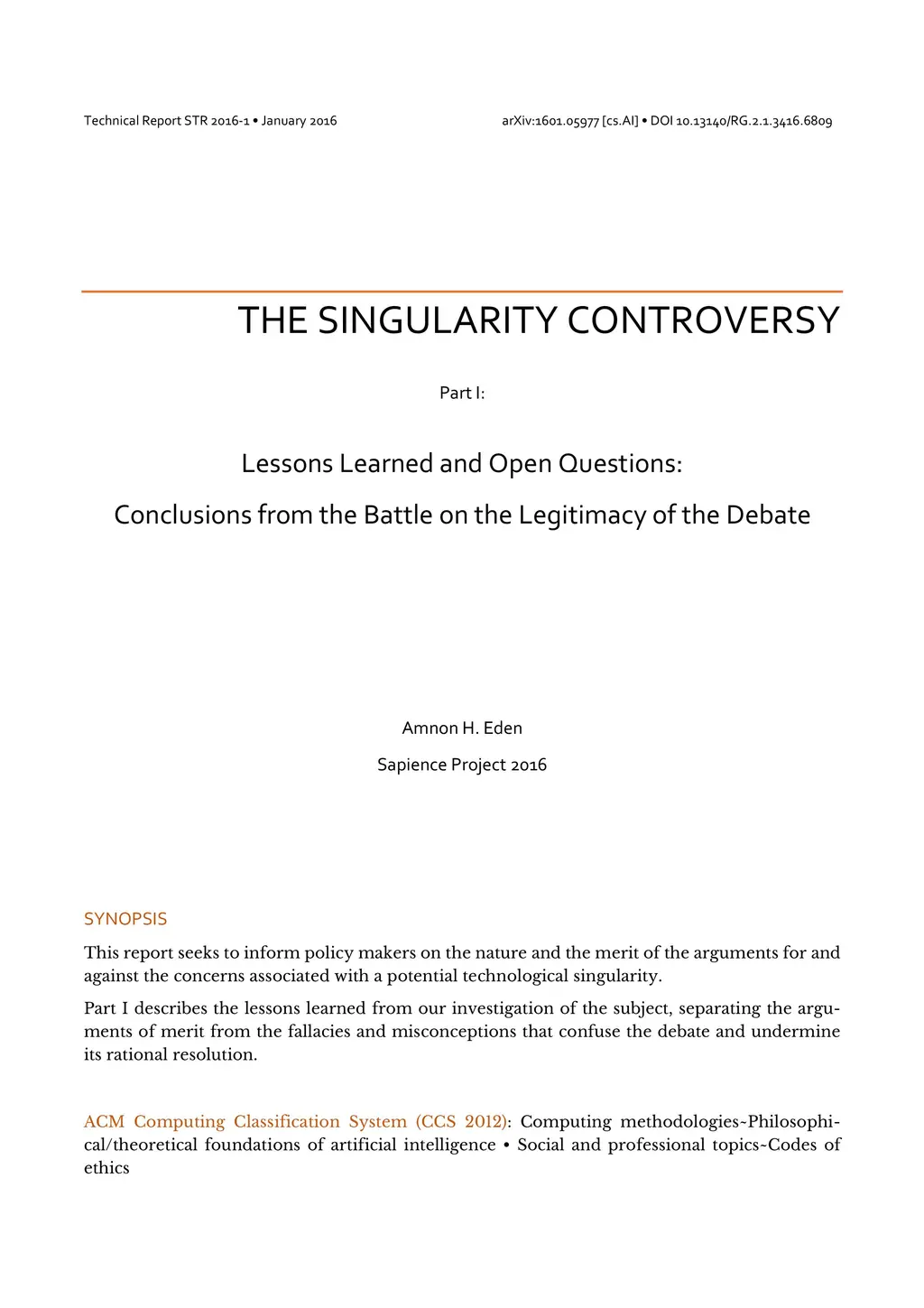 This report seeks to inform policy makers on the nature and the merit of the arguments for and against the concerns associated with a potential technological singularity. Part I describes the lessons learned from our investigation of the subject, separating the argu-ments of merit from the fallacies and misconceptions that confuse the debate and undermine its rational resolution.