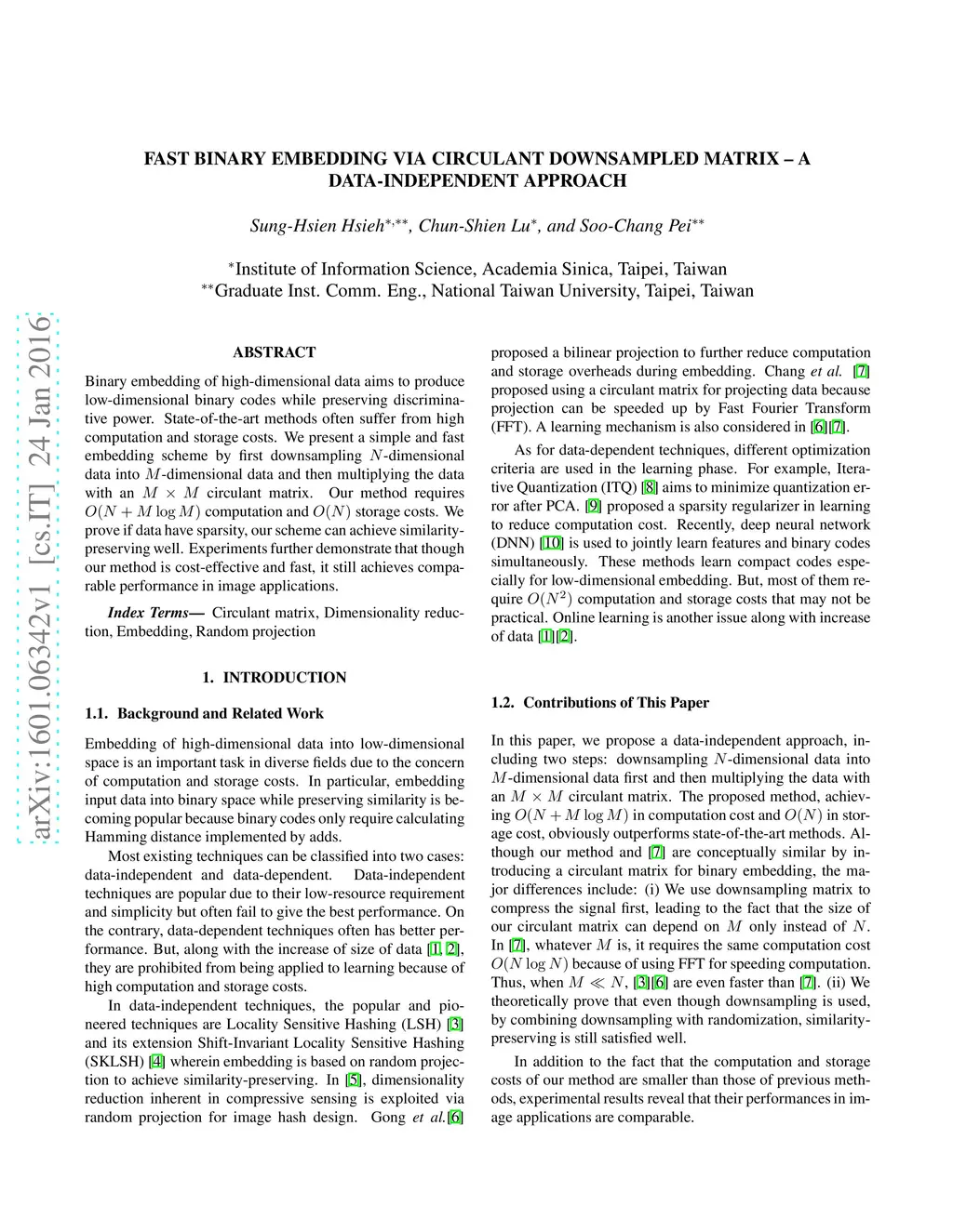 Binary embedding of high-dimensional data aims to produce low-dimensional binary codes while preserving discriminative power. State-of-the-art methods often suffer from high computation and storage costs. We present a simple and fast embedding scheme by first downsampling N-dimensional data into M-dimensional data and then multiplying the data with an MxM circulant matrix. Our method requires O(N +M log M) computation and O(N) storage costs. We prove if data have sparsity, our scheme can achieve similarity-preserving well. Experiments further demonstrate that though our method is cost-effective and fast, it still achieves comparable performance in image applications.