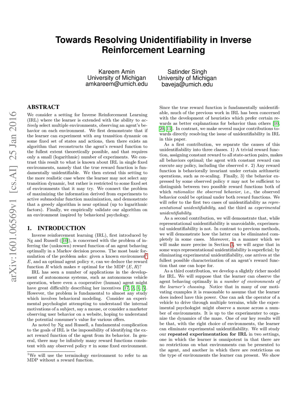 Towards Resolving Unidentifiability in Inverse Reinforcement Learning