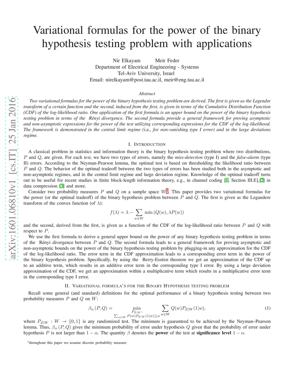 Two variational formulas for the power of the binary hypothesis testing problem are derived. The first is given as the Legendre transform of a certain function and the second, induced from the first, is given in terms of the Cumulative Distribution Function (CDF) of the log-likelihood ratio. One application of the first formula is an upper bound on the power of the binary hypothesis testing problem in terms of the Reñyi divergence. The second formula provide a general framework for proving asymptotic and non-asymptotic expressions for the power of the test utilizing corresponding expressions for the CDF of the log-likelihood. The framework is demonstrated in the central limit regime (i.e., for non-vanishing type I error) and in the large deviations regime.