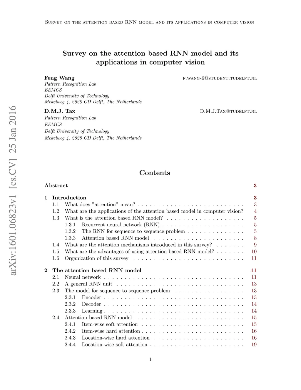 The recurrent neural networks (RNN) can be used to solve the sequence to sequence problem, where both the input and the output have sequential structures. Usually there are some implicit relations between the structures. However, it is hard for the common RNN model to fully explore the relations between the sequences. In this survey, we introduce some attention based RNN models which can focus on different parts of the input for each output item, in order to explore and take advantage of the implicit relations between the input and the output items. The different attention mechanisms are described in detail. We then introduce some applications in computer vision which apply the attention based RNN models. The superiority of the attention based RNN model is shown by the experimental results. At last some future research directions are given.