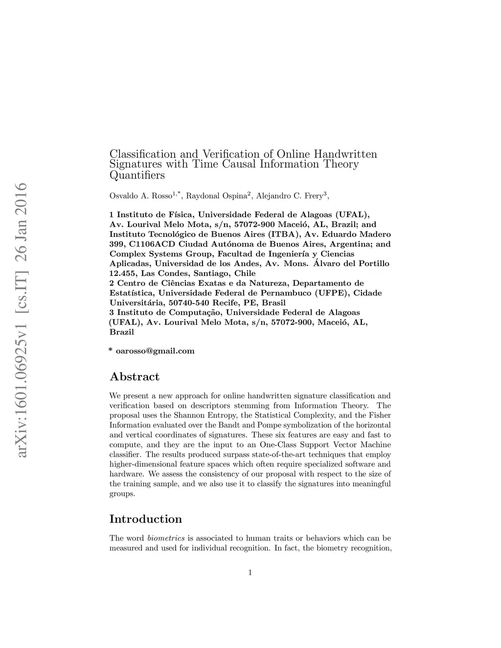 We present a new approach for online handwritten signature classification and verification based on descriptors stemming from Information Theory. The proposal uses the Shannon Entropy, the Statistical Complexity, and the Fisher Information evaluated over the Bandt and Pompe symbolization of the horizontal and vertical coordinates of signatures. These six features are easy and fast to compute, and they are the input to an One-Class Support Vector Machine classifier. The results produced surpass state-of-the-art techniques that employ higher-dimensional feature spaces which often require specialized software and hardware. We assess the consistency of our proposal with respect to the size of the training sample, and we also use it to classify the signatures into meaningful groups.