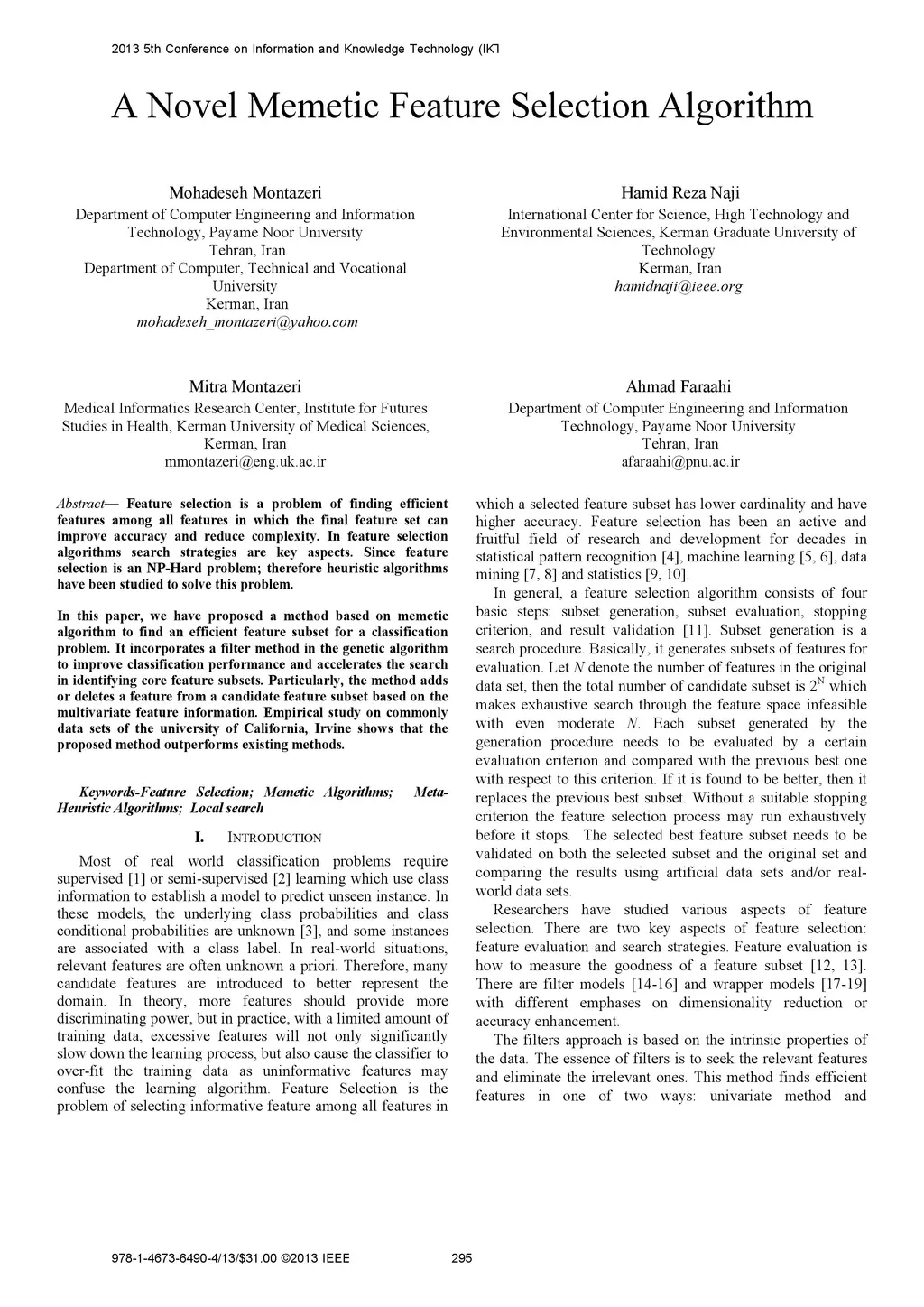 A Novel Memetic Feature Selection Algorithm