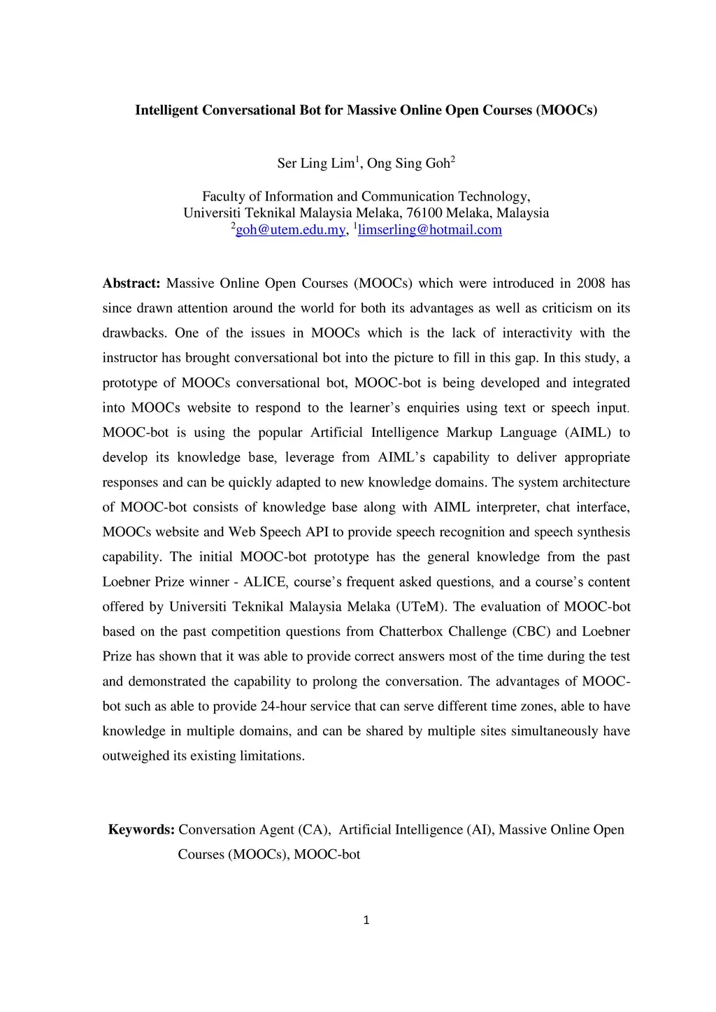 Massive Online Open Courses (MOOCs) which were introduced in 2008 has since drawn attention around the world for both its advantages as well as criticism on its drawbacks. One of the issues in MOOCs which is the lack of interactivity with the instructor has brought conversational bot into the picture to fill in this gap. In this study, a prototype of MOOCs conversational bot, MOOC-bot is being developed and integrated into MOOCs website to respond to the learner inquiries using text or speech input. MOOC-bot is using the popular Artificial Intelligence Markup Language (AIML) to develop its knowledge base, leverage from AIML capability to deliver appropriate responses and can be quickly adapted to new knowledge domains. The system architecture of MOOC-bot consists of knowledge base along with AIML interpreter, chat interface, MOOCs website and Web Speech API to provide speech recognition and speech synthesis capability. The initial MOOC-bot prototype has the general knowledge from the past Loebner Prize winner - ALICE, frequent asked questions, and a content offered by Universiti Teknikal Malaysia Melaka (UTeM). The evaluation of MOOC-bot based on the past competition questions from Chatterbox Challenge (CBC) and Loebner Prize has shown that it was able to provide correct answers most of the time during the test and demonstrated the capability to prolong the conversation. The advantages of MOOC-bot such as able to provide 24-hour service that can serve different time zones, able to have knowledge in multiple domains, and can be shared by multiple sites simultaneously have outweighed its existing limitations.
