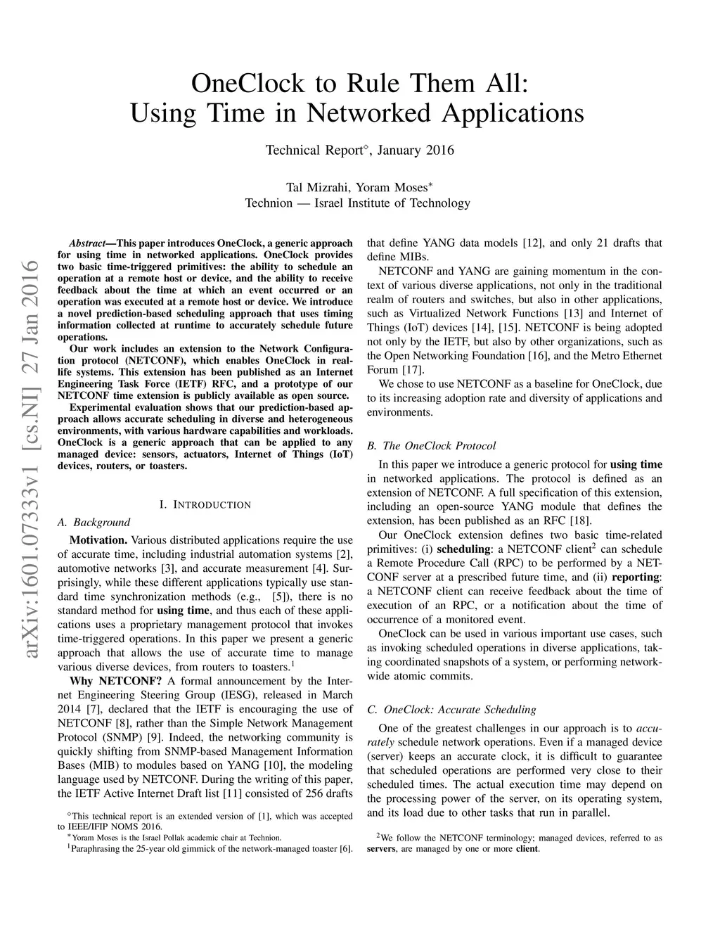 This paper introduces OneClock, a generic approach for using time in networked applications. OneClock provides two basic time-triggered primitives: the ability to schedule an operation at a remote host or device, and the ability to receive feedback about the time at which an event occurred or an operation was executed at a remote host or device. We introduce a novel prediction-based scheduling approach that uses timing information collected at runtime to accurately schedule future operations. Our work includes an extension to the Network Configuration protocol (NETCONF), which enables OneClock in real-life systems. This extension has been published as an Internet Engineering Task Force (IETF) RFC, and a prototype of our NETCONF time extension is publicly available as open source. Experimental evaluation shows that our prediction-based approach allows accurate scheduling in diverse and heterogeneous environments, with various hardware capabilities and workloads. OneClock is a generic approach that can be applied to any managed device: sensors, actuators, Internet of Things (IoT) devices, routers, or toasters.