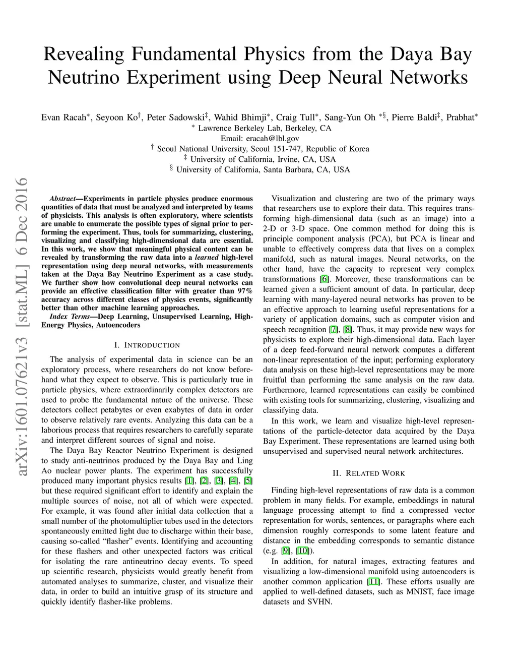 Experiments in particle physics produce enormous quantities of data that must be analyzed and interpreted by teams of physicists. This analysis is often exploratory, where scientists are unable to enumerate the possible types of signal prior to performing the experiment. Thus, tools for summarizing, clustering, visualizing and classifying high-dimensional data are essential. In this work, we show that meaningful physical content can be revealed by transforming the raw data into a learned high-level representation using deep neural networks, with measurements taken at the Daya Bay Neutrino Experiment as a case study. We further show how convolutional deep neural networks can provide an effective classification filter with greater than 97% accuracy across different classes of physics events, significantly better than other machine learning approaches.