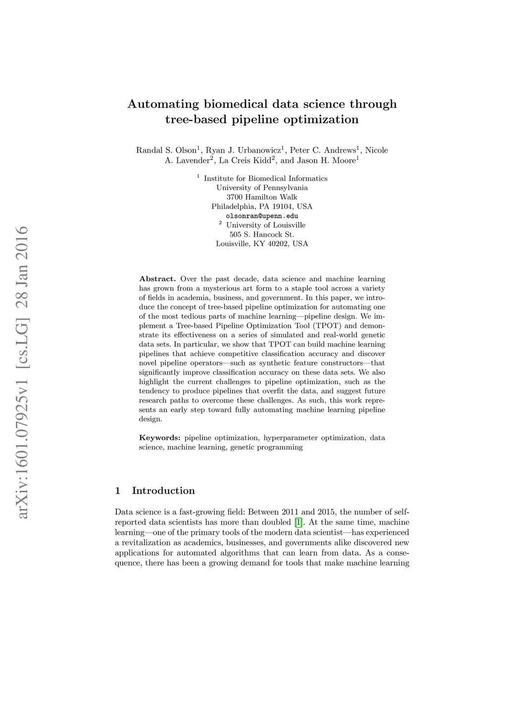 Over the past decade, data science and machine learning has grown from a mysterious art form to a staple tool across a variety of fields in academia, business, and government. In this paper, we introduce the concept of tree-based pipeline optimization for automating one of the most tedious parts of machine learning---pipeline design. We implement a Tree-based Pipeline Optimization Tool (TPOT) and demonstrate its effectiveness on a series of simulated and real-world genetic data sets. In particular, we show that TPOT can build machine learning pipelines that achieve competitive classification accuracy and discover novel pipeline operators---such as synthetic feature constructors---that significantly improve classification accuracy on these data sets. We also highlight the current challenges to pipeline optimization, such as the tendency to produce pipelines that overfit the data, and suggest future research paths to overcome these challenges. As such, this work represents an early step toward fully automating machine learning pipeline design.