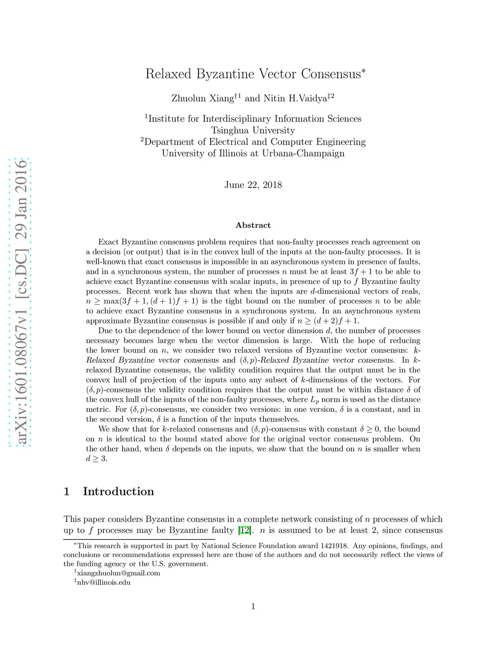 Exact Byzantine consensus problem requires that non-faulty processes reach agreement on a decision (or output) that is in the convex hull of the inputs at the non-faulty processes. It is well-known that exact consensus is impossible in an asynchronous system in presence of faults, and in a synchronous system, n>=3f+1 is tight on the number of processes to achieve exact Byzantine consensus with scalar inputs, in presence of up to f Byzantine faulty processes. Recent work has shown that when the inputs are d-dimensional vectors of reals, n>=max(3f+1,(d+1)f+1) is tight to achieve exact Byzantine consensus in synchronous systems, and n>= (d+2)f+1 for approximate Byzantine consensus in asynchronous systems. Due to the dependence of the lower bound on vector dimension d, the number of processes necessary becomes large when the vector dimension is large. With the hope of reducing the lower bound on n, we consider two relaxed versions of Byzantine vector consensus: k-Relaxed Byzantine vector consensus and (delta,p)-Relaxed Byzantine vector consensus. In k-relaxed consensus, the validity condition requires that the output must be in the convex hull of projection of the inputs onto any subset of k-dimensions of the vectors. For (delta,p)-consensus the validity condition requires that the output must be within distance delta of the convex hull of the inputs of the non-faulty processes, where L_p norm is used as the distance metric. For (delta,p)-consensus, we consider two versions: in one version, delta is a constant, and in the second version, delta is a function of the inputs themselves. We show that for k-relaxed consensus and (delta,p)-consensus with constant delta>=0, the bound on n is identical to the bound stated above for the original vector consensus problem. On the other hand, when delta depends on the inputs, we show that the bound on n is smaller when d>=3.