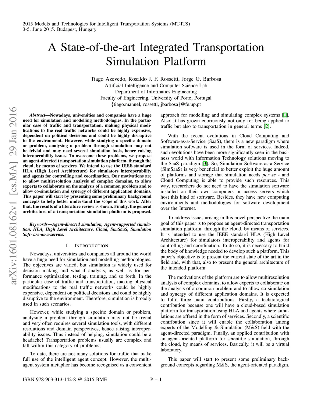 Nowadays, universities and companies have a huge need for simulation and modelling methodologies. In the particular case of traffic and transportation, making physical modifications to the real traffic networks could be highly expensive, dependent on political decisions and could be highly disruptive to the environment. However, while studying a specific domain or problem, analysing a problem through simulation may not be trivial and may need several simulation tools, hence raising interoperability issues. To overcome these problems, we propose an agent-directed transportation simulation platform, through the cloud, by means of services. We intend to use the IEEE standard HLA (High Level Architecture) for simulators interoperability and agents for controlling and coordination. Our motivations are to allow multiresolution analysis of complex domains, to allow experts to collaborate on the analysis of a common problem and to allow co-simulation and synergy of different application domains. This paper will start by presenting some preliminary background concepts to help better understand the scope of this work. After that, the results of a literature review is shown. Finally, the general architecture of a transportation simulation platform is proposed.