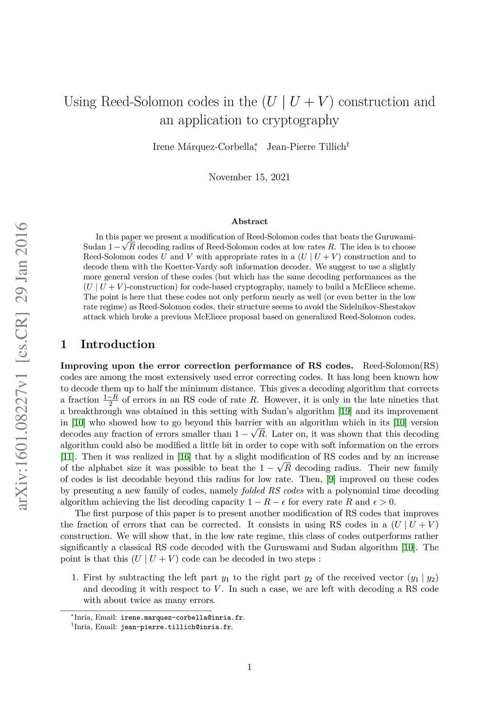 In this paper we present a modification of Reed-Solomon codes that beats the Guruwami-Sudan decoding radius of Reed-Solomon codes at low rates . The idea is to choose Reed-Solomon codes and with appropriate rates in a construction and to decode them with the Koetter-Vardy soft information decoder. We suggest to use a slightly more general version of these codes (but which has the same decoding performances as the -construction) for code-based cryptography, namely to build a McEliece scheme. The point is here that these codes not only perform nearly as well (or even better in the low rate regime) as Reed-Solomon codes, their structure seems to avoid the Sidelnikov-Shestakov attack which broke a previous McEliece proposal based on generalized Reed-Solomon codes.
