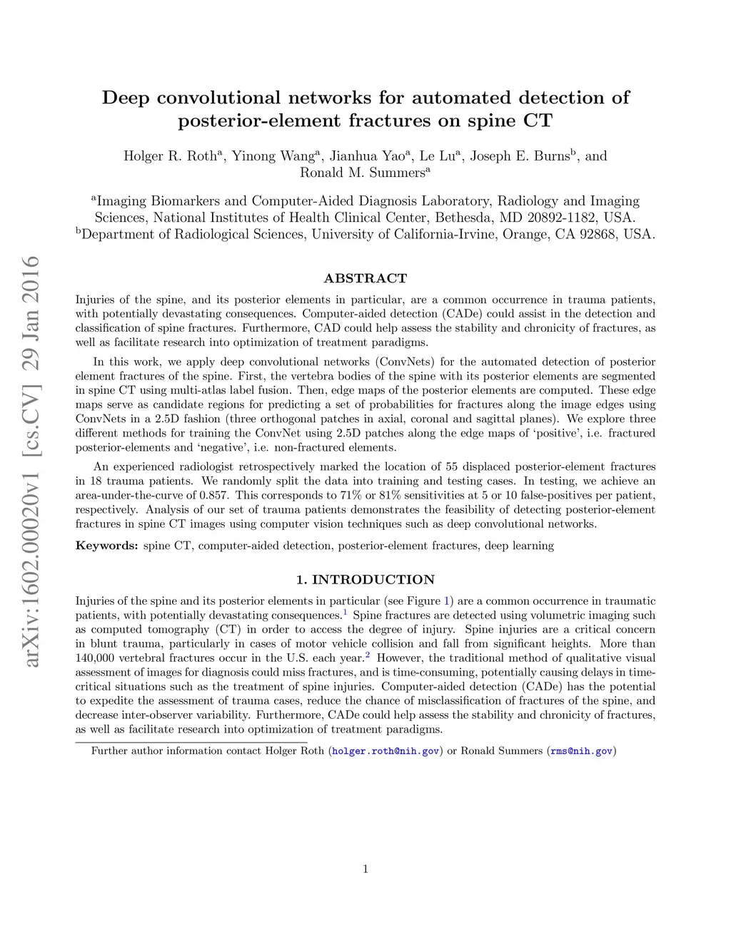 Injuries of the spine, and its posterior elements in particular, are a common occurrence in trauma patients, with potentially devastating consequences. Computer-aided detection (CADe) could assist in the detection and classification of spine fractures. Furthermore, CAD could help assess the stability and chronicity of fractures, as well as facilitate research into optimization of treatment paradigms. In this work, we apply deep convolutional networks (ConvNets) for the automated detection of posterior element fractures of the spine. First, the vertebra bodies of the spine with its posterior elements are segmented in spine CT using multi-atlas label fusion. Then, edge maps of the posterior elements are computed. These edge maps serve as candidate regions for predicting a set of probabilities for fractures along the image edges using ConvNets in a 2.5D fashion (three orthogonal patches in axial, coronal and sagittal planes). We explore three different methods for training the ConvNet using 2.5D patches along the edge maps of 'positive', i.e. fractured posterior-elements and ñegative', i.e. non-fractured elements. An experienced radiologist retrospectively marked the location of 55 displaced posterior-element fractures in 18 trauma patients. We randomly split the data into training and testing cases. In testing, we achieve an area-under-the-curve of 0.857. This corresponds to 71% or 81% sensitivities at 5 or 10 false-positives per patient, respectively. Analysis of our set of trauma patients demonstrates the feasibility of detecting posterior-element fractures in spine CT images using computer vision techniques such as deep convolutional networks.