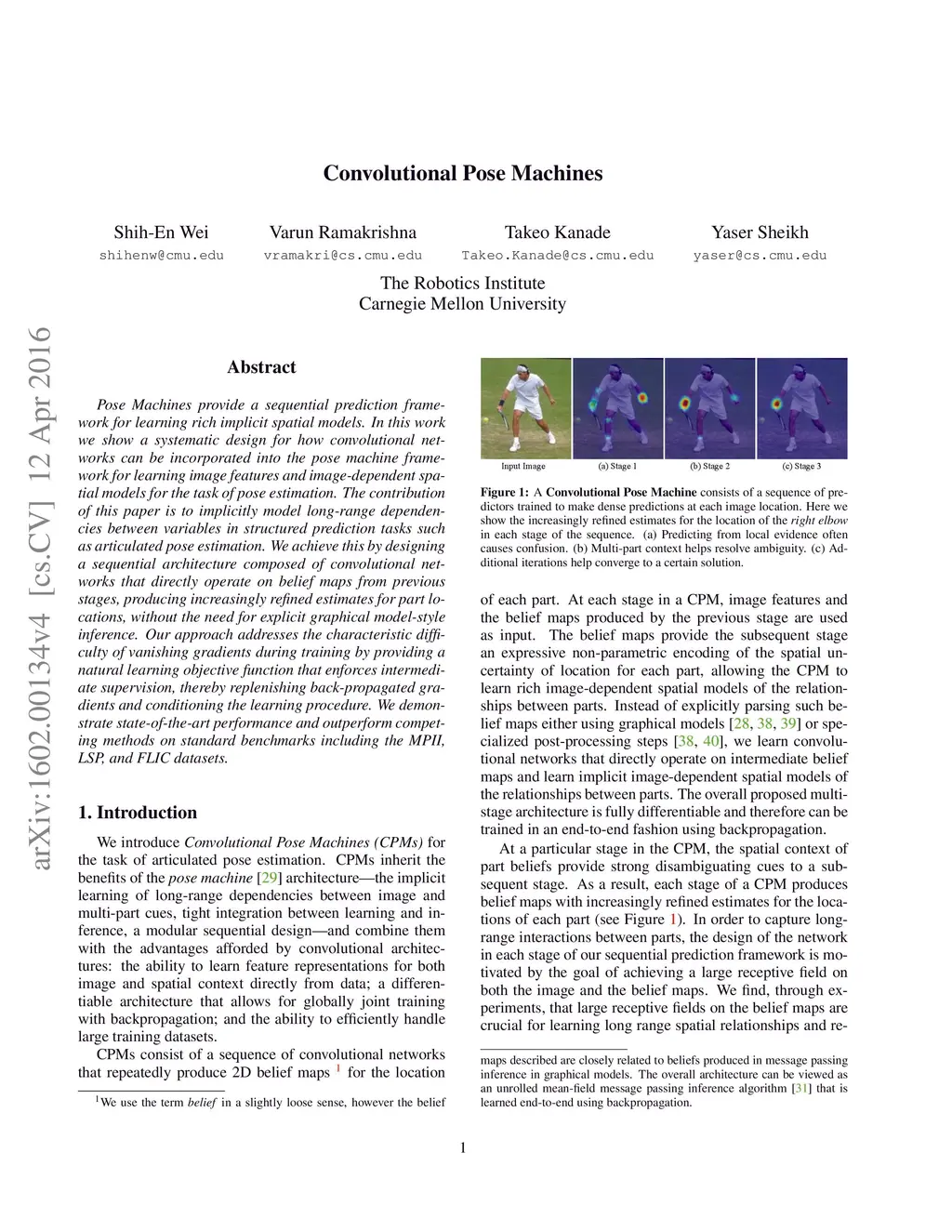 Pose Machines provide a sequential prediction framework for learning rich implicit spatial models. In this work we show a systematic design for how convolutional networks can be incorporated into the pose machine framework for learning image features and image-dependent spatial models for the task of pose estimation. The contribution of this paper is to implicitly model long-range dependencies between variables in structured prediction tasks such as articulated pose estimation. We achieve this by designing a sequential architecture composed of convolutional networks that directly operate on belief maps from previous stages, producing increasingly refined estimates for part locations, without the need for explicit graphical model-style inference. Our approach addresses the characteristic difficulty of vanishing gradients during training by providing a natural learning objective function that enforces intermediate supervision, thereby replenishing back-propagated gradients and conditioning the learning procedure. We demonstrate state-of-the-art performance and outperform competing methods on standard benchmarks including the MPII, LSP, and FLIC datasets.