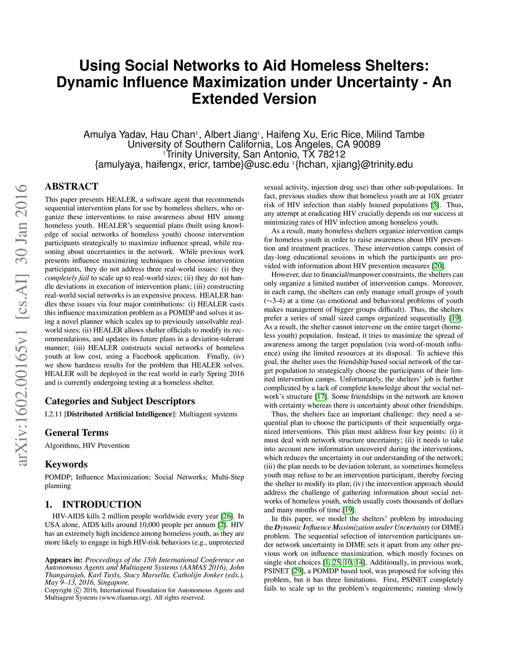 This paper presents HEALER, a software agent that recommends sequential intervention plans for use by homeless shelters, who organize these interventions to raise awareness about HIV among homeless youth. HEALER's sequential plans (built using knowledge of social networks of homeless youth) choose intervention participants strategically to maximize influence spread, while reasoning about uncertainties in the network. While previous work presents influence maximizing techniques to choose intervention participants, they do not address three real-world issues: (i) they completely fail to scale up to real-world sizes; (ii) they do not handle deviations in execution of intervention plans; (iii) constructing real-world social networks is an expensive process. HEALER handles these issues via four major contributions: (i) HEALER casts this influence maximization problem as a POMDP and solves it using a novel planner which scales up to previously unsolvable real-world sizes; (ii) HEALER allows shelter officials to modify its recommendations, and updates its future plans in a deviation-tolerant manner; (iii) HEALER constructs social networks of homeless youth at low cost, using a Facebook application. Finally, (iv) we show hardness results for the problem that HEALER solves. HEALER will be deployed in the real world in early Spring 2016 and is currently undergoing testing at a homeless shelter.