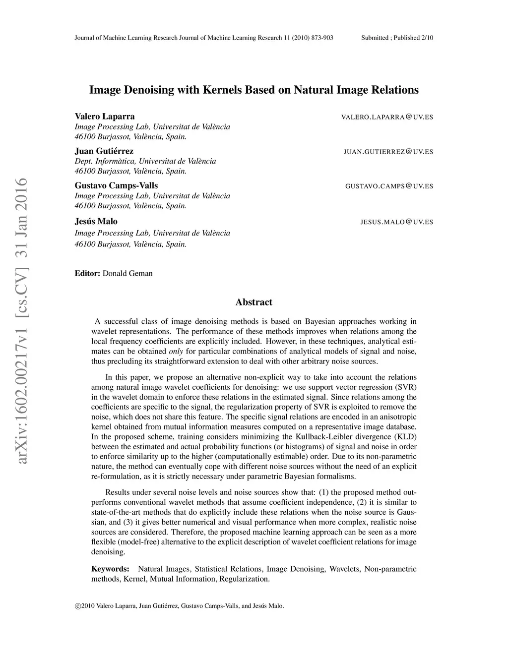 A successful class of image denoising methods is based on Bayesian approaches working in wavelet representations. However, analytical estimates can be obtained only for particular combinations of analytical models of signal and noise, thus precluding its straightforward extension to deal with other arbitrary noise sources. In this paper, we propose an alternative non-explicit way to take into account the relations among natural image wavelet coefficients for denoising: we use support vector regression (SVR) in the wavelet domain to enforce these relations in the estimated signal. Since relations among the coefficients are specific to the signal, the regularization property of SVR is exploited to remove the noise, which does not share this feature. The specific signal relations are encoded in an anisotropic kernel obtained from mutual information measures computed on a representative image database. Training considers minimizing the Kullback-Leibler divergence (KLD) between the estimated and actual probability functions of signal and noise in order to enforce similarity. Due to its non-parametric nature, the method can eventually cope with different noise sources without the need of an explicit re-formulation, as it is strictly necessary under parametric Bayesian formalisms. Results under several noise levels and noise sources show that: (1) the proposed method outperforms conventional wavelet methods that assume coefficient independence, (2) it is similar to state-of-the-art methods that do explicitly include these relations when the noise source is Gaussian, and (3) it gives better numerical and visual performance when more complex, realistic noise sources are considered. Therefore, the proposed machine learning approach can be seen as a more flexible (model-free) alternative to the explicit description of wavelet coefficient relations for image denoising.