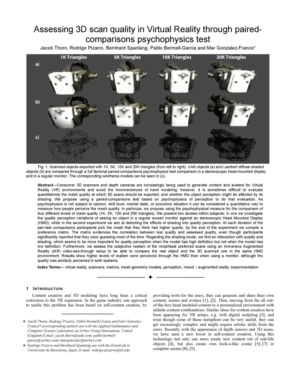 Consumer 3D scanners and depth cameras are increasingly being used to generate content and avatars for Virtual Reality (VR) environments and avoid the inconveniences of hand modeling; however, it is sometimes difficult to evaluate quantitatively the mesh quality at which 3D scans should be exported, and whether the object perception might be affected by its shading. We propose using a paired-comparisons test based on psychophysics of perception to do that evaluation. As psychophysics is not subject to opinion, skill level, mental state, or economic situation it can be considered a quantitative way to measure how people perceive the mesh quality. In particular, we propose using the psychophysical measure for the comparison of four different levels of mesh quality (1K, 5K, 10K and 20K triangles). We present two studies within subjects: in one we investigate the quality perception variations of seeing an object in a regular screen monitor against an stereoscopic Head Mounted Display (HMD); while in the second experiment we aim at detecting the effects of shading into quality perception. At each iteration of the pair-test comparisons participants pick the mesh that they think had higher quality; by the end of the experiment we compile a preference matrix. The matrix evidences the correlation between real quality and assessed quality. Regarding the shading mode, we find an interaction with quality and shading when the model has high definition. Furthermore, we assess the subjective realism of the most/least preferred scans using an Immersive Augmented Reality (IAR) video-see-through setup. Results show higher levels of realism were perceived through the HMD than when using a monitor, although the quality was similarly perceived in both systems.