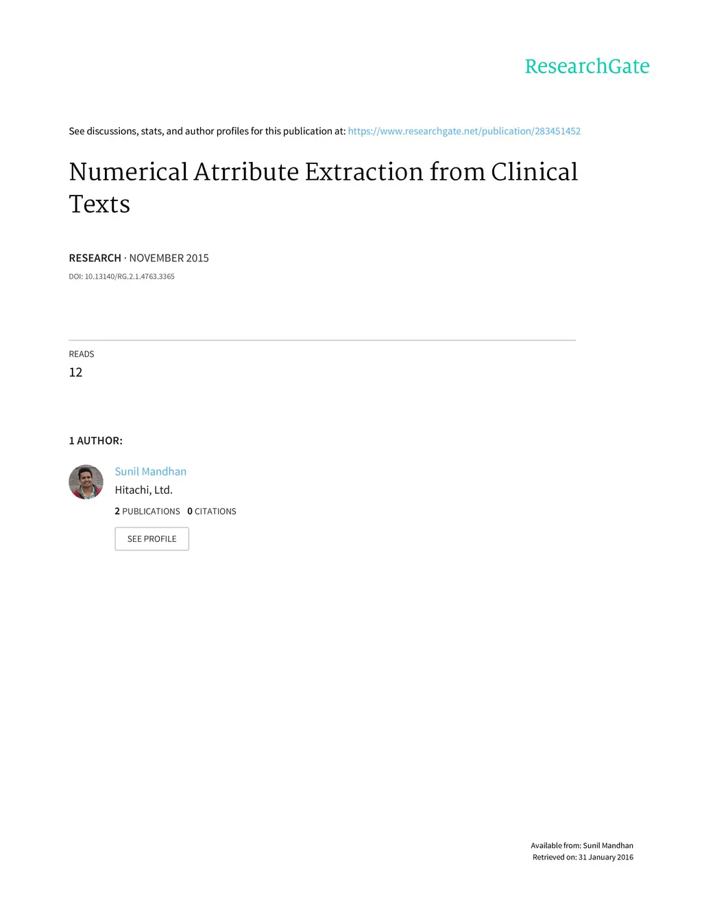 This paper describes about information extraction system, which is an extension of the system developed by team Hitachi for "Disease/Disorder Template filling" task organized by ShARe/CLEF eHealth Evolution Lab 2014. In this extension module we focus on extraction of numerical attributes and values from discharge summary records and associating correct relation between attributes and values. We solve the problem in two steps. First step is extraction of numerical attributes and values, which is developed as a Named Entity Recognition (NER) model using Stanford NLP libraries. Second step is correctly associating the attributes to values, which is developed as a relation extraction module in Apache cTAKES framework. We integrated Stanford NER model as cTAKES pipeline component and used in relation extraction module. Conditional Random Field (CRF) algorithm is used for NER and Support Vector Machines (SVM) for relation extraction. For attribute value relation extraction, we observe 95% accuracy using NER alone and combined accuracy of 87% with NER and SVM.