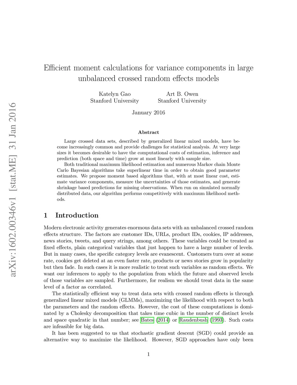 Large crossed data sets, described by generalized linear mixed models, have become increasingly common and provide challenges for statistical analysis. At very large sizes it becomes desirable to have the computational costs of estimation, inference and prediction (both space and time) grow at most linearly with sample size. Both traditional maximum likelihood estimation and numerous Markov chain Monte Carlo Bayesian algorithms take superlinear time in order to obtain good parameter estimates. We propose moment based algorithms that, with at most linear cost, estimate variance components, measure the uncertainties of those estimates, and generate shrinkage based predictions for missing observations. When run on simulated normally distributed data, our algorithm performs competitively with maximum likelihood methods.