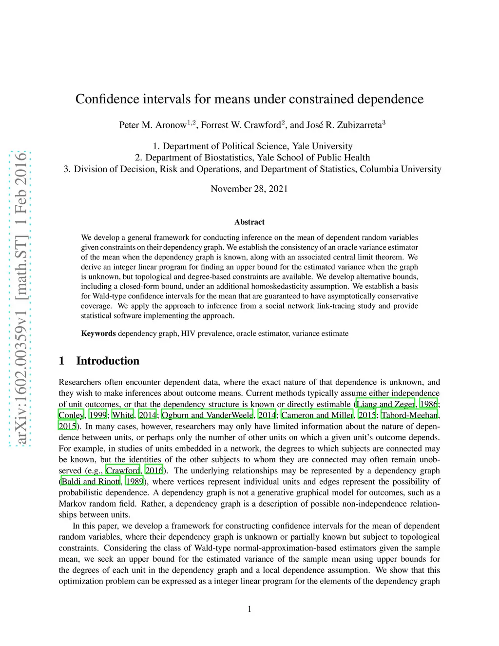 We develop a general framework for conducting inference on the mean of dependent random variables given constraints on their dependency graph. We establish the consistency of an oracle variance estimator of the mean when the dependency graph is known, along with an associated central limit theorem. We derive an integer linear program for finding an upper bound for the estimated variance when the graph is unknown, but topological and degree-based constraints are available. We develop alternative bounds, including a closed-form bound, under an additional homoskedasticity assumption. We establish a basis for Wald-type confidence intervals for the mean that are guaranteed to have asymptotically conservative coverage. We apply the approach to inference from a social network link-tracing study and provide statistical software implementing the approach.