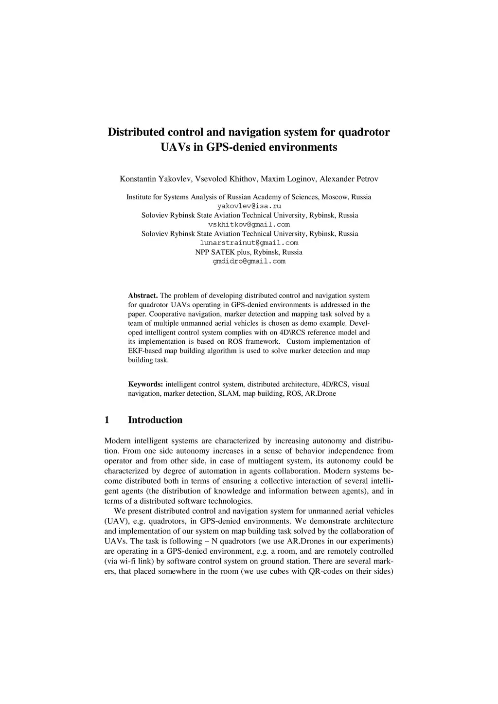 The problem of developing distributed control and navigation system for quadrotor UAVs operating in GPS-denied environments is addressed in the paper. Cooperative navigation, marker detection and mapping task solved by a team of multiple unmanned aerial vehicles is chosen as demo example. Developed intelligent control system complies with on 4D\RCS reference model and its implementation is based on ROS framework. Custom implementation of EKF-based map building algorithm is used to solve marker detection and map building task.