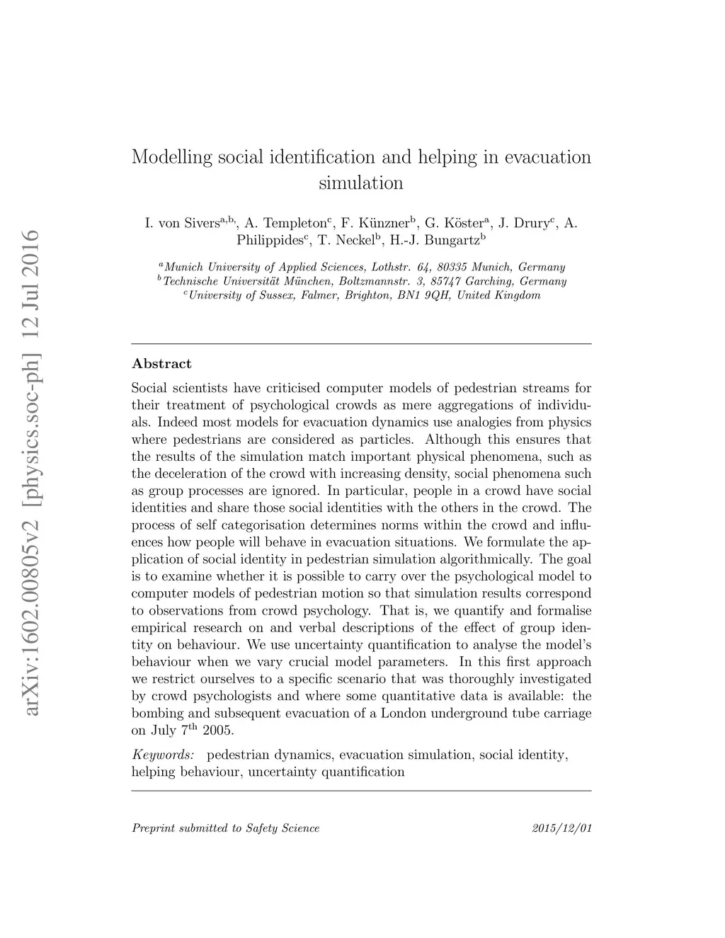 Social scientists have criticised computer models of pedestrian streams for their treatment of psychological crowds as mere aggregations of individuals. Indeed most models for evacuation dynamics use analogies from physics where pedestrians are considered as particles. Although this ensures that the results of the simulation match important physical phenomena, such as the deceleration of the crowd with increasing density, social phenomena such as group processes are ignored. In particular, people in a crowd have social identities and share those social identities with the others in the crowd. The process of self categorisation determines norms within the crowd and influences how people will behave in evacuation situations. We formulate the application of social identity in pedestrian simulation algorithmically. The goal is to examine whether it is possible to carry over the psychological model to computer models of pedestrian motion so that simulation results correspond to observations from crowd psychology. That is, we quantify and formalise empirical research on and verbal descriptions of the effect of group identity on behaviour. We use uncertainty quantification to analyse the model's behaviour when we vary crucial model parameters. In this first approach we restrict ourselves to a specific scenario that was thoroughly investigated by crowd psychologists and where some quantitative data is available: the bombing and subsequent evacuation of a London underground tube carriage on July 7th 2005.