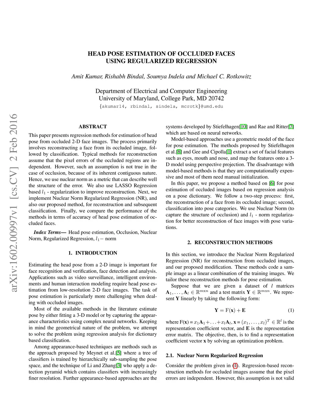 This paper presents regression methods for estimation of head pose from occluded 2-D face images. The process primarily involves reconstructing a face from its occluded image, followed by classification. Typical methods for reconstruction assume that the pixel errors of the occluded regions are independent. However, such an assumption is not true in the case of occlusion, because of its inherent contiguous nature. Hence, we use nuclear norm as a metric that can describe well the structure of the error. We also use LASSO Regression based l1 - regularization to improve reconstruction. Next, we implement Nuclear Norm Regularized Regression (NR), and also our proposed method, for reconstruction and subsequent classification. Finally, we compare the performance of the methods in terms of accuracy of head pose estimation of occluded faces.