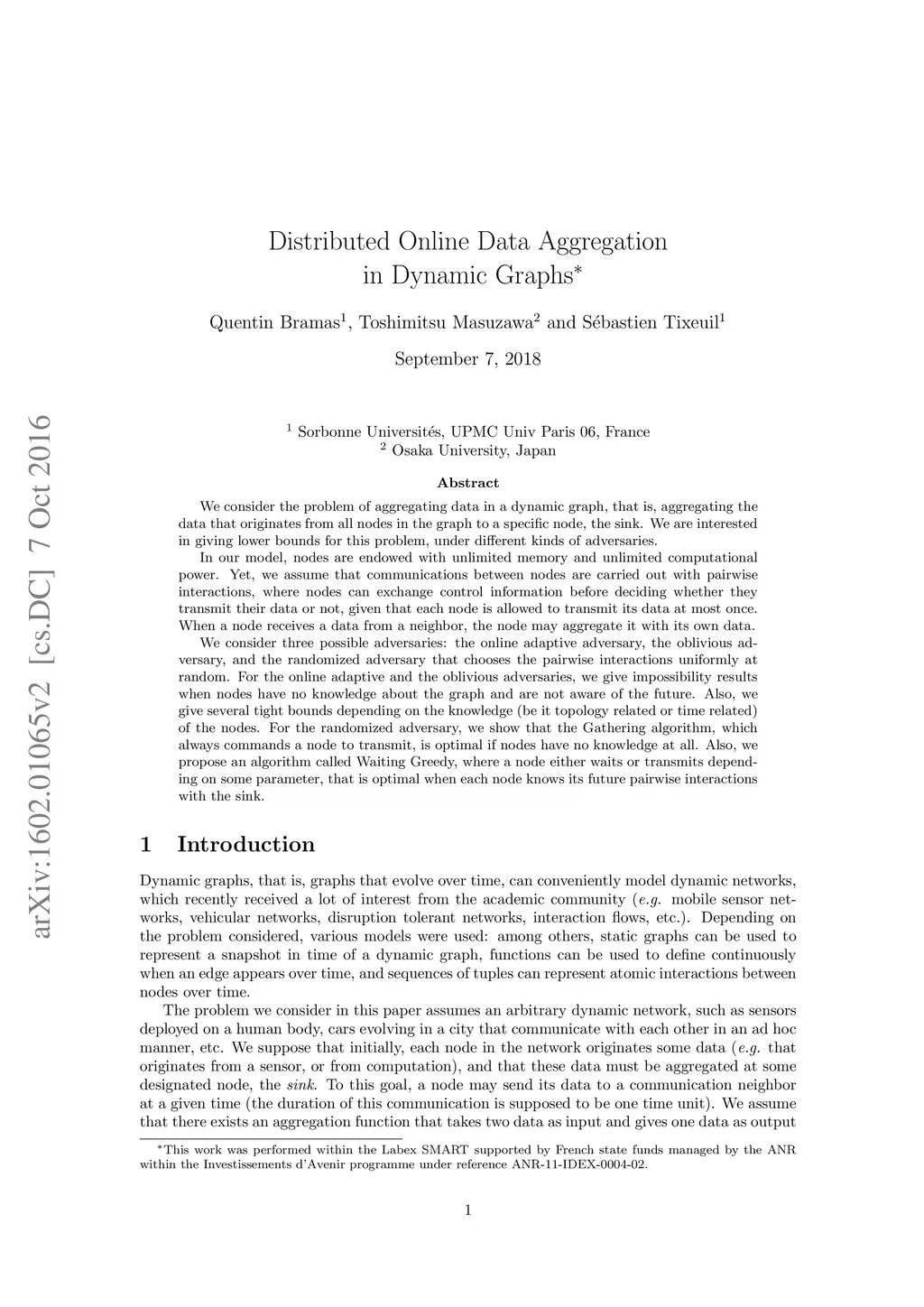 We consider the problem of aggregating data in a dynamic graph, that is, aggregating the data that originates from all nodes in the graph to a specific node, the sink. We are interested in giving lower bounds for this problem, under different kinds of adversaries. In our model, nodes are endowed with unlimited memory and unlimited computational power. Yet, we assume that communications between nodes are carried out with pairwise interactions, where nodes can exchange control information before deciding whether they transmit their data or not, given that each node is allowed to transmit its data at most once. When a node receives a data from a neighbor, the node may aggregate it with its own data. We consider three possible adversaries: the online adaptive adversary, the oblivious adversary , and the randomized adversary that chooses the pairwise interactions uniformly at random. For the online adaptive and the oblivious adversary, we give impossibility results when nodes have no knowledge about the graph and are not aware of the future. Also, we give several tight bounds depending on the knowledge (be it topology related or time related) of the nodes. For the randomized adversary, we show that the Gathering algorithm, which always commands a node to transmit, is optimal if nodes have no knowledge at all. Also, we propose an algorithm called Waiting Greedy, where a node either waits or transmits depending on some parameter, that is optimal when each node knows its future pairwise interactions with the sink.