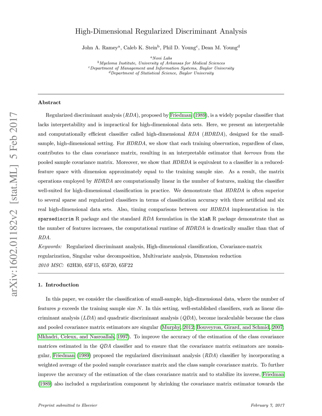 Regularized discriminant analysis (RDA), proposed by Friedman (1989), is a widely popular classifier that lacks interpretability and is impractical for high-dimensional data sets. Here, we present an interpretable and computationally efficient classifier called high-dimensional RDA (HDRDA), designed for the small-sample, high-dimensional setting. For HDRDA, we show that each training observation, regardless of class, contributes to the class covariance matrix, resulting in an interpretable estimator that borrows from the pooled sample covariance matrix. Moreover, we show that HDRDA is equivalent to a classifier in a reduced-feature space with dimension approximately equal to the training sample size. As a result, the matrix operations employed by HDRDA are computationally linear in the number of features, making the classifier well-suited for high-dimensional classification in practice. We demonstrate that HDRDA is often superior to several sparse and regularized classifiers in terms of classification accuracy with three artificial and six real high-dimensional data sets. Also, timing comparisons between our HDRDA implementation in the sparsediscrim R package and the standard RDA formulation in the klaR R package demonstrate that as the number of features increases, the computational runtime of HDRDA is drastically smaller than that of RDA.