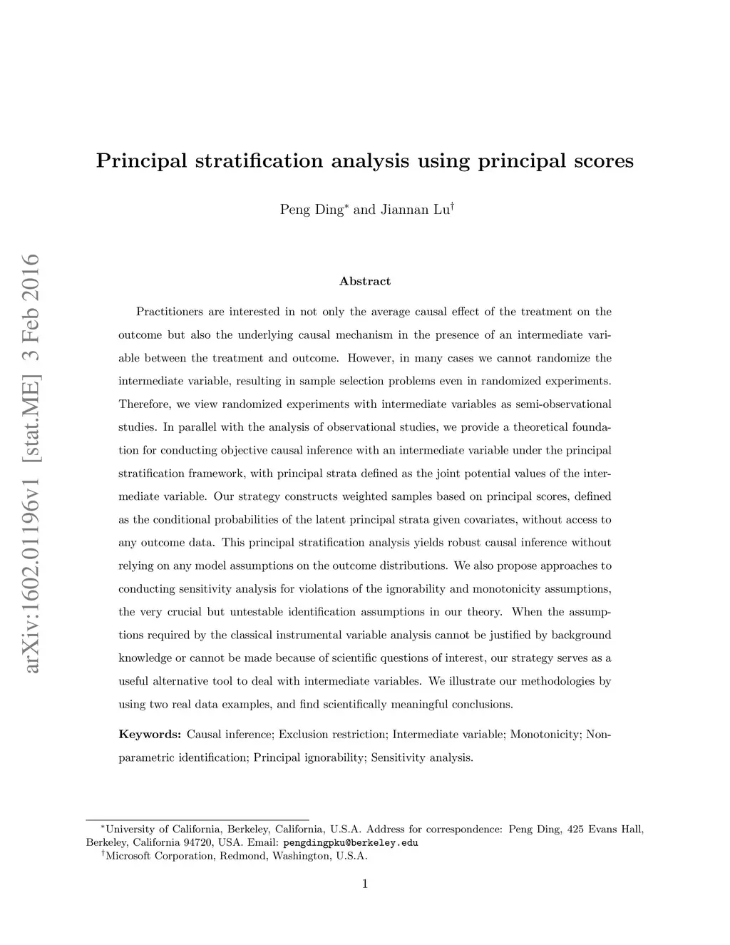 Practitioners are interested in not only the average causal effect of the treatment on the outcome but also the underlying causal mechanism in the presence of an intermediate variable between the treatment and outcome. However, in many cases we cannot randomize the intermediate variable, resulting in sample selection problems even in randomized experiments. Therefore, we view randomized experiments with intermediate variables as semi-observational studies. In parallel with the analysis of observational studies, we provide a theoretical foundation for conducting objective causal inference with an intermediate variable under the principal stratification framework, with principal strata defined as the joint potential values of the intermediate variable. Our strategy constructs weighted samples based on principal scores, defined as the conditional probabilities of the latent principal strata given covariates, without access to any outcome data. This principal stratification analysis yields robust causal inference without relying on any model assumptions on the outcome distributions. We also propose approaches to conducting sensitivity analysis for violations of the ignorability and monotonicity assumptions, the very crucial but untestable identification assumptions in our theory. When the assumptions required by the classical instrumental variable analysis cannot be justified by background knowledge or cannot be made because of scientific questions of interest, our strategy serves as a useful alternative tool to deal with intermediate variables. We illustrate our methodologies by using two real data examples, and find scientifically meaningful conclusions.