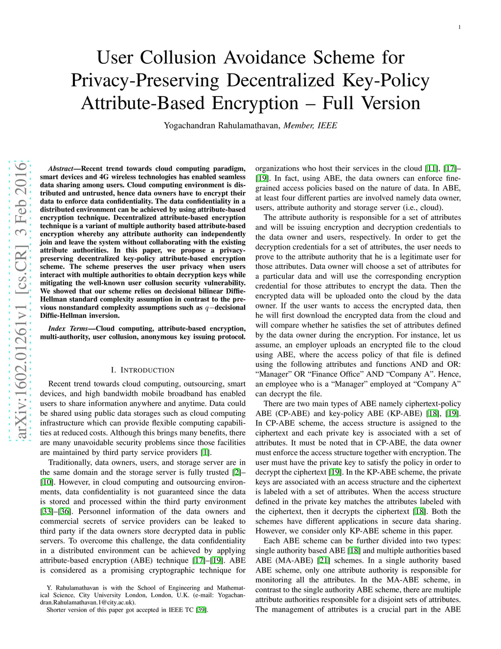 User Collusion Avoidance Scheme for Privacy-Preserving Decentralized