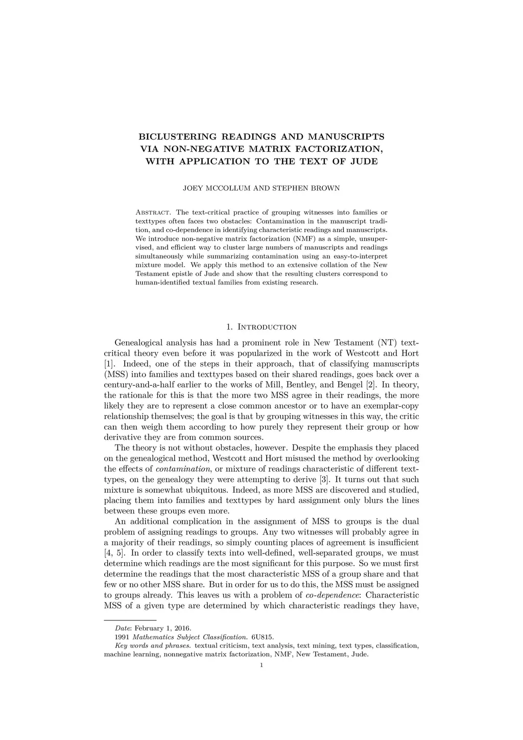 The text-critical practice of grouping witnesses into families or texttypes often faces two obstacles: Contamination in the manuscript tradition, and co-dependence in identifying characteristic readings and manuscripts. We introduce non-negative matrix factorization (NMF) as a simple, unsupervised, and efficient way to cluster large numbers of manuscripts and readings simultaneously while summarizing contamination using an easy-to-interpret mixture model. We apply this method to an extensive collation of the New Testament epistle of Jude and show that the resulting clusters correspond to human-identified textual families from existing research.