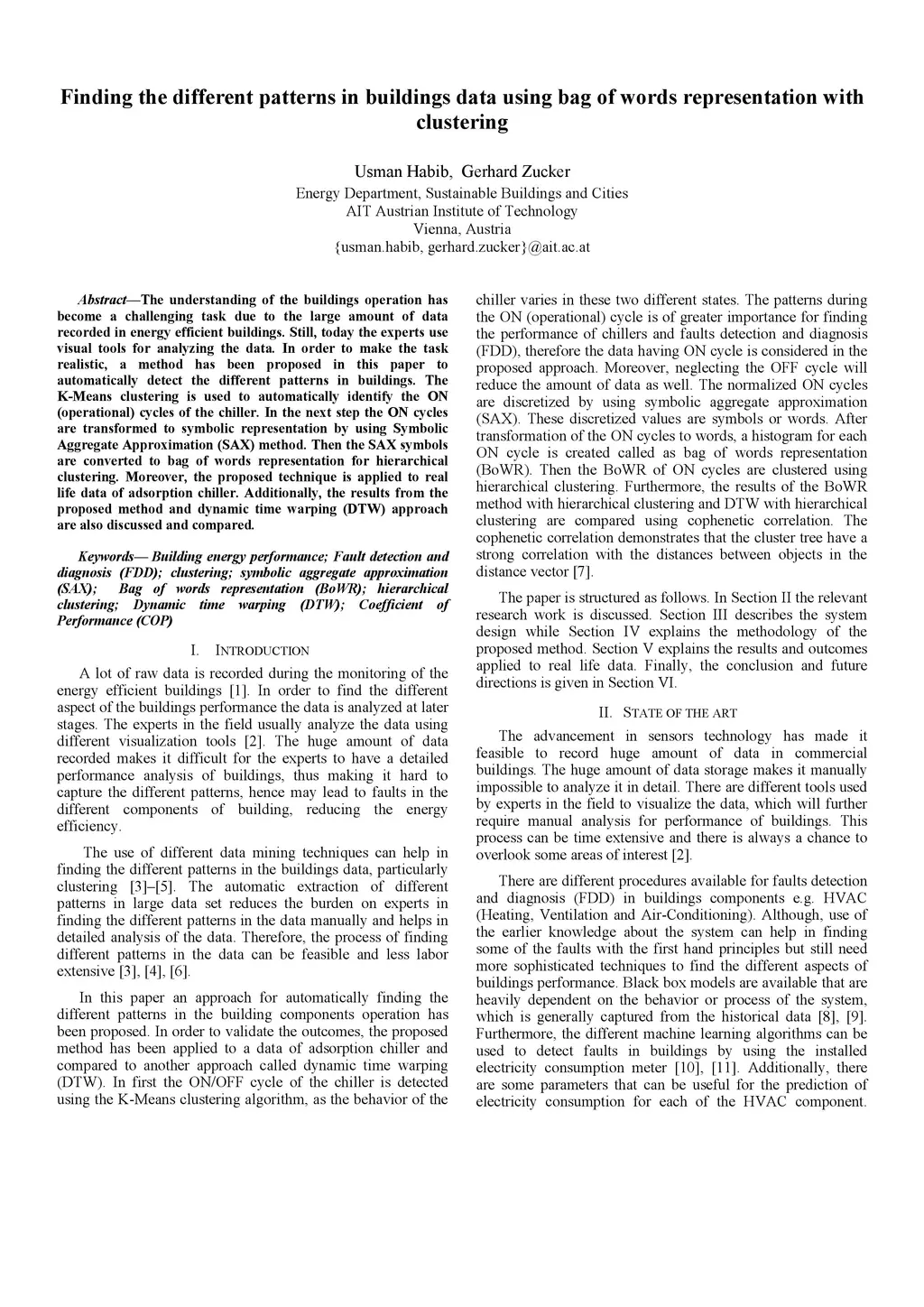 The understanding of the buildings operation has become a challenging task due to the large amount of data recorded in energy efficient buildings. Still, today the experts use visual tools for analyzing the data. In order to make the task realistic, a method has been proposed in this paper to automatically detect the different patterns in buildings. The K Means clustering is used to automatically identify the ON (operational) cycles of the chiller. In the next step the ON cycles are transformed to symbolic representation by using Symbolic Aggregate Approximation (SAX) method. Then the SAX symbols are converted to bag of words representation for hierarchical clustering. Moreover, the proposed technique is applied to real life data of adsorption chiller. Additionally, the results from the proposed method and dynamic time warping (DTW) approach are also discussed and compared.