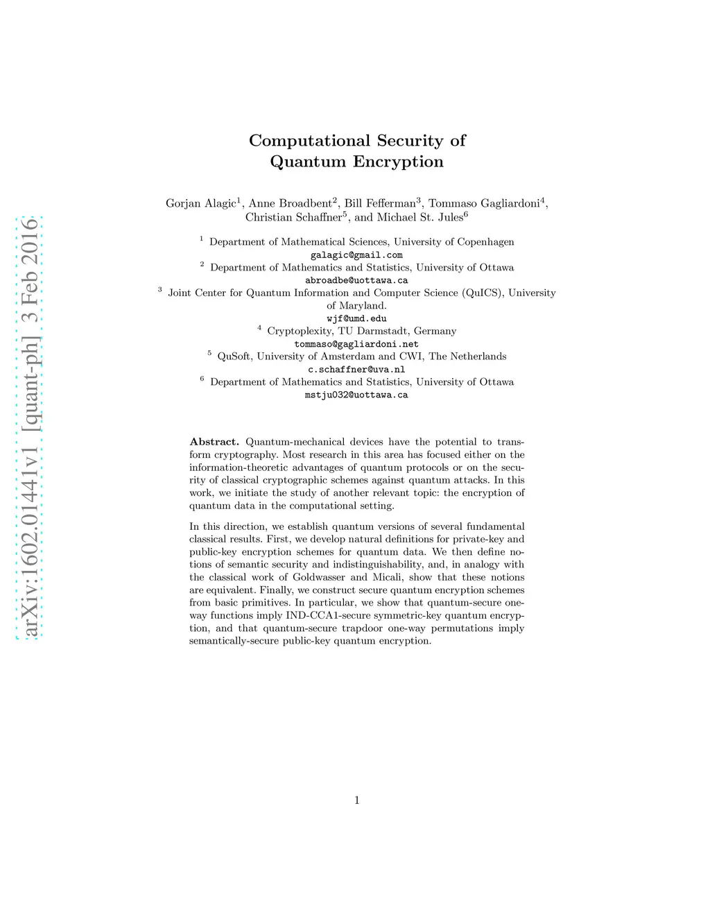 Quantum-mechanical devices have the potential to transform cryptography. Most research in this area has focused either on the information-theoretic advantages of quantum protocols or on the security of classical cryptographic schemes against quantum attacks. In this work, we initiate the study of another relevant topic: the encryption of quantum data in the computational setting. In this direction, we establish quantum versions of several fundamental classical results. First, we develop natural definitions for private-key and public-key encryption schemes for quantum data. We then define notions of semantic security and indistinguishability, and, in analogy with the classical work of Goldwasser and Micali, show that these notions are equivalent. Finally, we construct secure quantum encryption schemes from basic primitives. In particular, we show that quantum-secure one-way functions imply IND-CCA1-secure symmetric-key quantum encryption, and that quantum-secure trapdoor one-way permutations imply semantically-secure public-key quantum encryption.