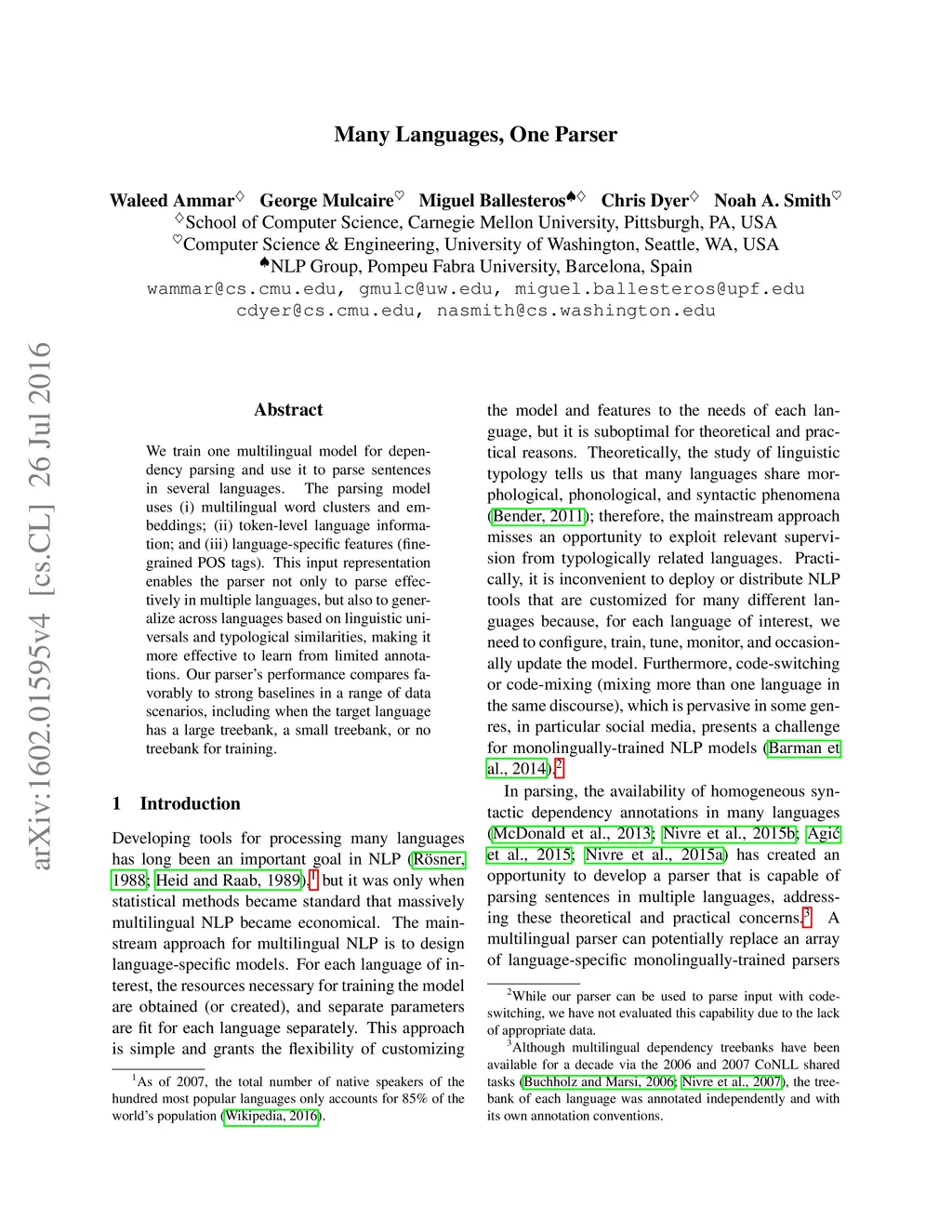 We train one multilingual model for dependency parsing and use it to parse sentences in several languages. The parsing model uses (i) multilingual word clusters and embeddings; (ii) token-level language information; and (iii) language-specific features (fine-grained POS tags). This input representation enables the parser not only to parse effectively in multiple languages, but also to generalize across languages based on linguistic universals and typological similarities, making it more effective to learn from limited annotations. Our parser's performance compares favorably to strong baselines in a range of data scenarios, including when the target language has a large treebank, a small treebank, or no treebank for training.