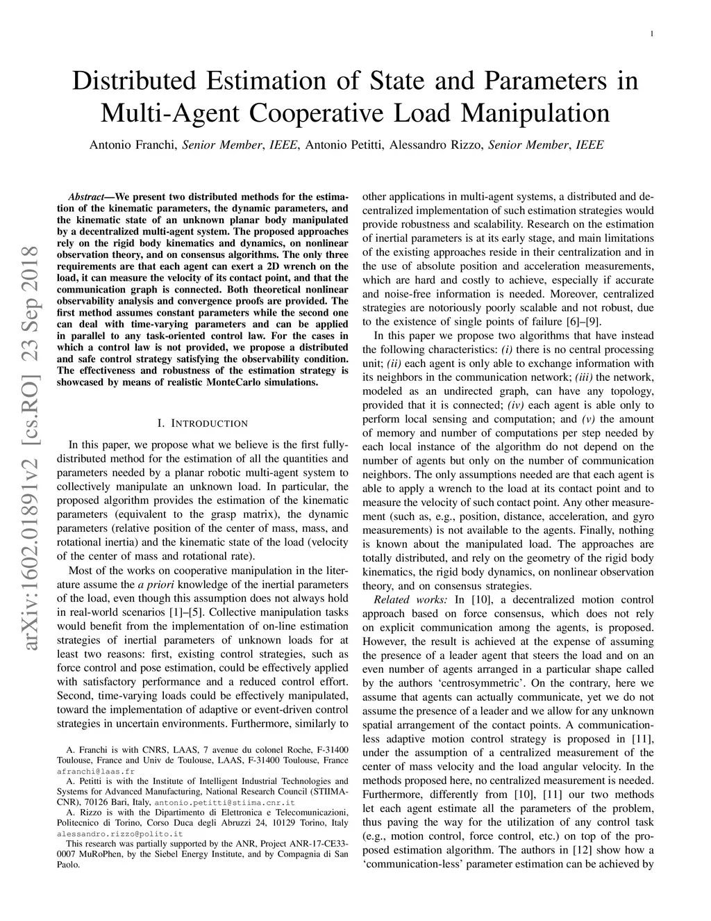We present two distributed methods for the estimation of the kinematic parameters, the dynamic parameters, and the kinematic state of an unknown planar body manipulated by a decentralized multi-agent system. The proposed approaches rely on the rigid body kinematics and dynamics, on nonlinear observation theory, and on consensus algorithms. The only three requirements are that each agent can exert a 2D wrench on the load, it can measure the velocity of its contact point, and that the communication graph is connected. Both theoretical nonlinear observability analysis and convergence proofs are provided. The first method assumes constant parameters while the second one can deal with time-varying parameters and can be applied in parallel to any task-oriented control law. For the cases in which a control law is not provided, we propose a distributed and safe control strategy satisfying the observability condition. The effectiveness and robustness of the estimation strategy is showcased by means of realistic MonteCarlo simulations.