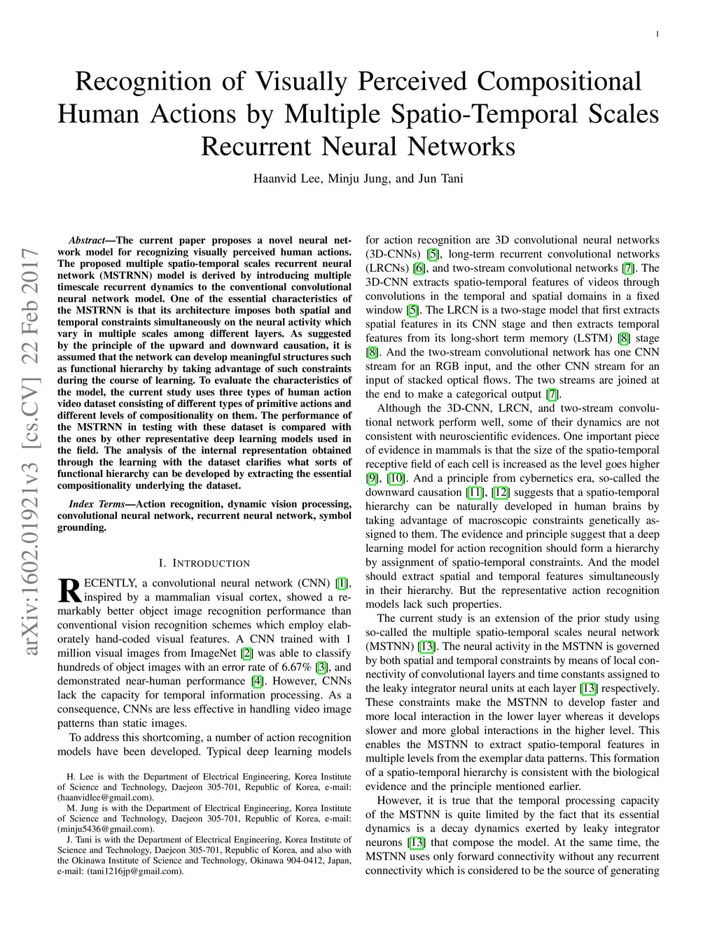The current paper proposes a novel neural network model for recognizing visually perceived human actions. The proposed multiple spatio-temporal scales recurrent neural network (MSTRNN) model is derived by introducing multiple timescale recurrent dynamics to the conventional convolutional neural network model. One of the essential characteristics of the MSTRNN is that its architecture imposes both spatial and temporal constraints simultaneously on the neural activity which vary in multiple scales among different layers. As suggested by the principle of the upward and downward causation, it is assumed that the network can develop meaningful structures such as functional hierarchy by taking advantage of such constraints during the course of learning. To evaluate the characteristics of the model, the current study uses three types of human action video dataset consisting of different types of primitive actions and different levels of compositionality on them. The performance of the MSTRNN in testing with these dataset is compared with the ones by other representative deep learning models used in the field. The analysis of the internal representation obtained through the learning with the dataset clarifies what sorts of functional hierarchy can be developed by extracting the essential compositionality underlying the dataset.