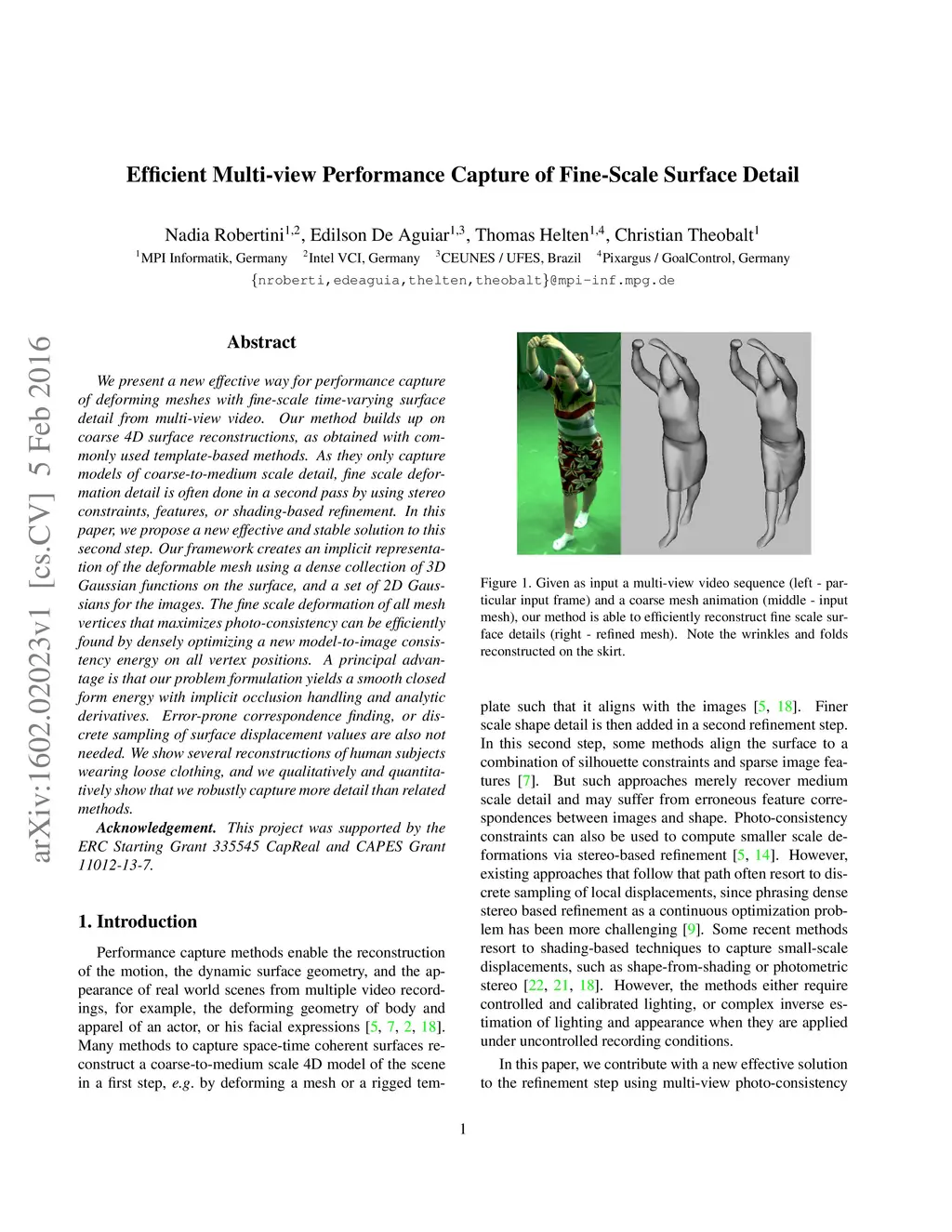 We present a new effective way for performance capture of deforming meshes with fine-scale time-varying surface detail from multi-view video. Our method builds up on coarse 4D surface reconstructions, as obtained with commonly used template-based methods. As they only capture models of coarse-to-medium scale detail, fine scale deformation detail is often done in a second pass by using stereo constraints, features, or shading-based refinement. In this paper, we propose a new effective and stable solution to this second step. Our framework creates an implicit representation of the deformable mesh using a dense collection of 3D Gaussian functions on the surface, and a set of 2D Gaussians for the images. The fine scale deformation of all mesh vertices that maximizes photo-consistency can be efficiently found by densely optimizing a new model-to-image consistency energy on all vertex positions. A principal advantage is that our problem formulation yields a smooth closed form energy with implicit occlusion handling and analytic derivatives. Error-prone correspondence finding, or discrete sampling of surface displacement values are also not needed. We show several reconstructions of human subjects wearing loose clothing, and we qualitatively and quantitatively show that we robustly capture more detail than related methods.