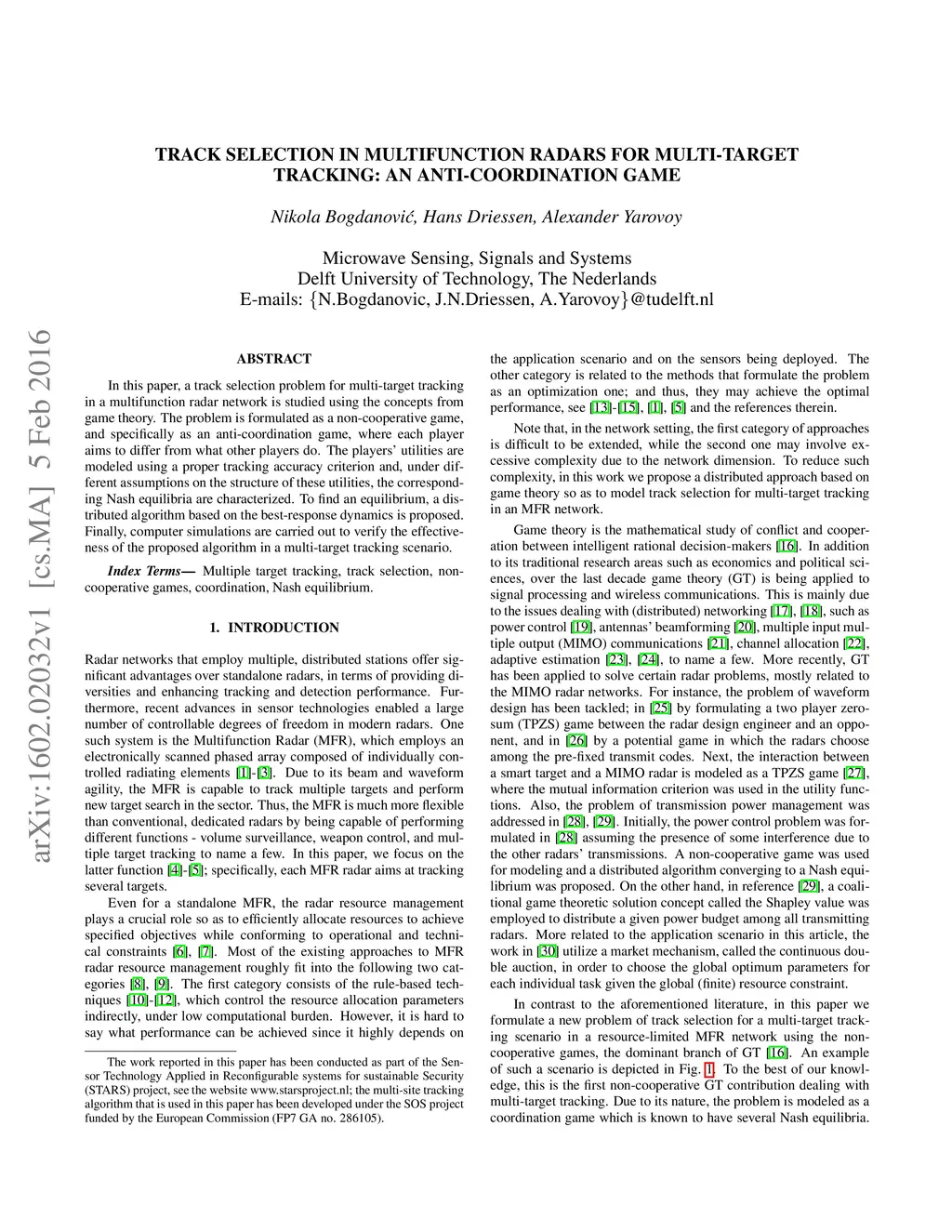 In this paper, a track selection problem for multi-target tracking in a multifunction radar network is studied using the concepts from game theory. The problem is formulated as a non-cooperative game, and specifically as an anti-coordination game, where each player aims to differ from what other players do. The players' utilities are modeled using a proper tracking accuracy criterion and, under different assumptions on the structure of these utilities, the corresponding Nash equilibria are characterized. To find an equilibrium, a distributed algorithm based on the best-response dynamics is proposed. Finally, computer simulations are carried out to verify the effectiveness of the proposed algorithm in a multi-target tracking scenario.