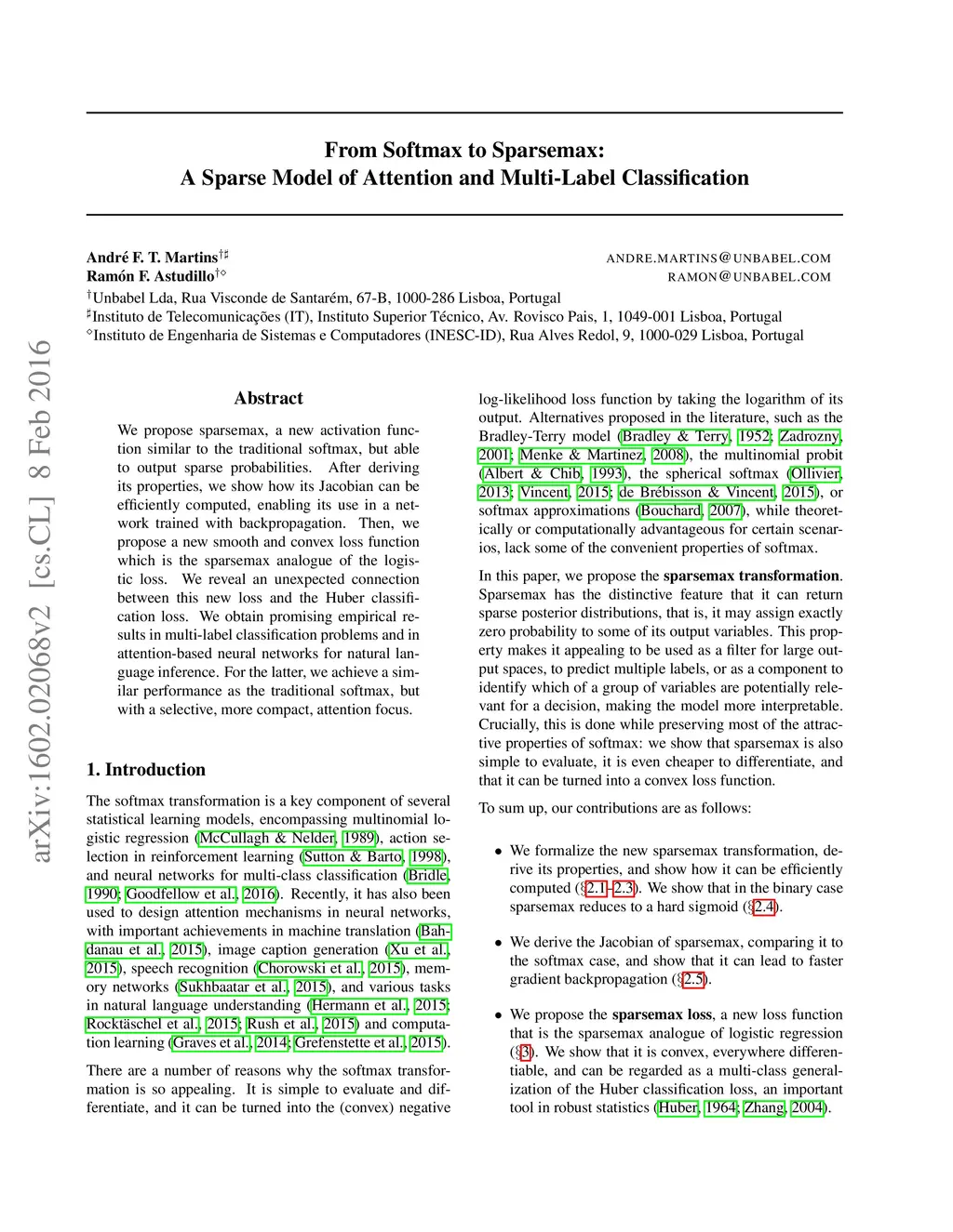 From Softmax to Sparsemax: A Sparse Model of Attention and Multi-Label