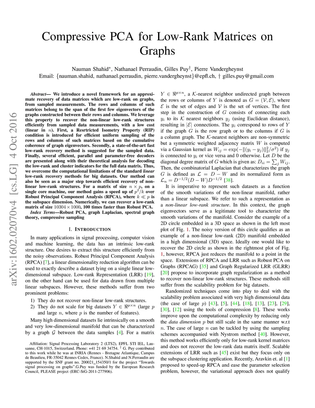 We introduce a novel framework for an approxi- mate recovery of data matrices which are low-rank on graphs, from sampled measurements. The rows and columns of such matrices belong to the span of the first few eigenvectors of the graphs constructed between their rows and columns. We leverage this property to recover the non-linear low-rank structures efficiently from sampled data measurements, with a low cost (linear in n). First, a Resrtricted Isometry Property (RIP) condition is introduced for efficient uniform sampling of the rows and columns of such matrices based on the cumulative coherence of graph eigenvectors. Secondly, a state-of-the-art fast low-rank recovery method is suggested for the sampled data. Finally, several efficient, parallel and parameter-free decoders are presented along with their theoretical analysis for decoding the low-rank and cluster indicators for the full data matrix. Thus, we overcome the computational limitations of the standard linear low-rank recovery methods for big datasets. Our method can also be seen as a major step towards efficient recovery of non- linear low-rank structures. For a matrix of size n X p, on a single core machine, our method gains a speed up of over Robust Principal Component Analysis (RPCA), where k << p is the subspace dimension. Numerically, we can recover a low-rank matrix of size 10304 X 1000, 100 times faster than Robust PCA.
