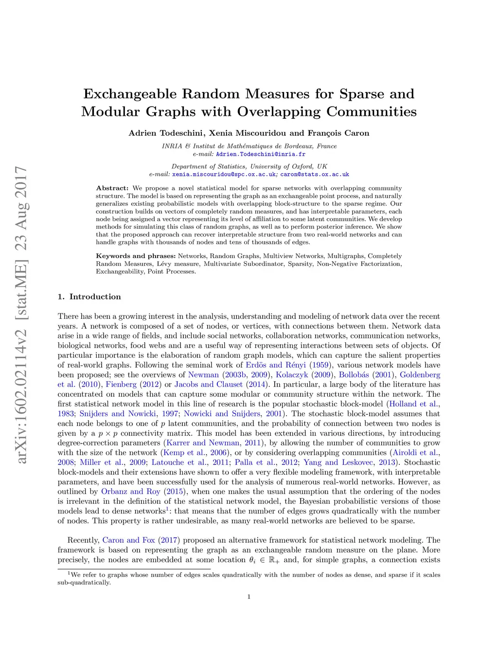 We propose a novel statistical model for sparse networks with overlapping community structure. The model is based on representing the graph as an exchangeable point process, and naturally generalizes existing probabilistic models with overlapping block-structure to the sparse regime. Our construction builds on vectors of completely random measures, and has interpretable parameters, each node being assigned a vector representing its level of affiliation to some latent communities. We develop methods for simulating this class of random graphs, as well as to perform posterior inference. We show that the proposed approach can recover interpretable structure from two real-world networks and can handle graphs with thousands of nodes and tens of thousands of edges.
