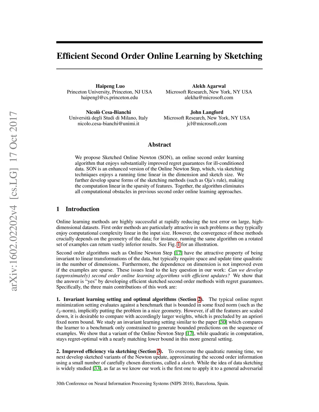 We propose Sketched Online Newton (SON), an online second order learning algorithm that enjoys substantially improved regret guarantees for ill-conditioned data. SON is an enhanced version of the Online Newton Step, which, via sketching techniques enjoys a running time linear in the dimension and sketch size. We further develop sparse forms of the sketching methods (such as Oja's rule), making the computation linear in the sparsity of features. Together, the algorithm eliminates all computational obstacles in previous second order online learning approaches.