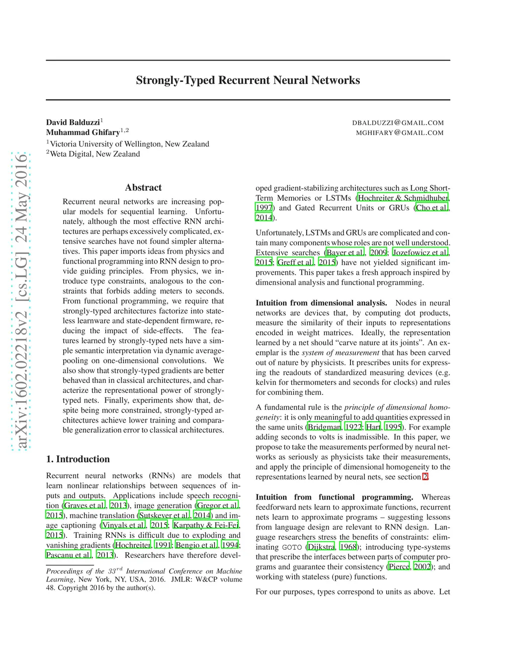 Recurrent neural networks are increasing popular models for sequential learning. Unfortunately, although the most effective RNN architectures are perhaps excessively complicated, extensive searches have not found simpler alternatives. This paper imports ideas from physics and functional programming into RNN design to provide guiding principles. From physics, we introduce type constraints, analogous to the constraints that forbids adding meters to seconds. From functional programming, we require that strongly-typed architectures factorize into stateless learnware and state-dependent firmware, reducing the impact of side-effects. The features learned by strongly-typed nets have a simple semantic interpretation via dynamic average-pooling on one-dimensional convolutions. We also show that strongly-typed gradients are better behaved than in classical architectures, and characterize the representational power of strongly-typed nets. Finally, experiments show that, despite being more constrained, strongly-typed architectures achieve lower training and comparable generalization error to classical architectures.