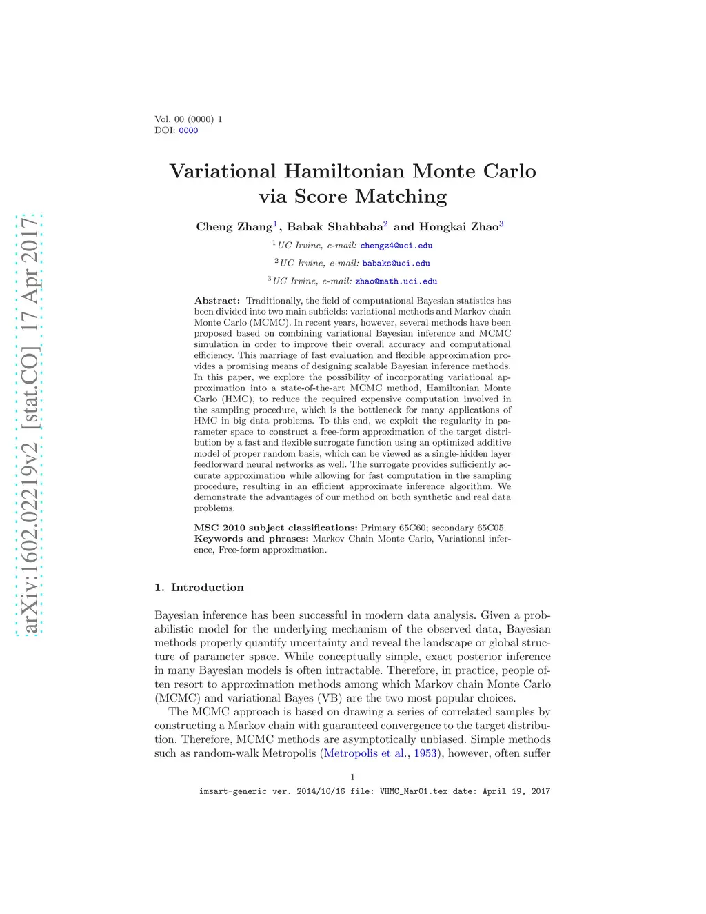 Traditionally, the field of computational Bayesian statistics has been divided into two main subfields: variational methods and Markov chain Monte Carlo (MCMC). In recent years, however, several methods have been proposed based on combining variational Bayesian inference and MCMC simulation in order to improve their overall accuracy and computational efficiency. This marriage of fast evaluation and flexible approximation provides a promising means of designing scalable Bayesian inference methods. In this paper, we explore the possibility of incorporating variational approximation into a state-of-the-art MCMC method, Hamiltonian Monte Carlo (HMC), to reduce the required gradient computation in the simulation of Hamiltonian flow, which is the bottleneck for many applications of HMC in big data problems. To this end, we use a {\it free-form} approximation induced by a fast and flexible surrogate function based on single-hidden layer feedforward neural networks. The surrogate provides sufficiently accurate approximation while allowing for fast exploration of parameter space, resulting in an efficient approximate inference algorithm. We demonstrate the advantages of our method on both synthetic and real data problems.