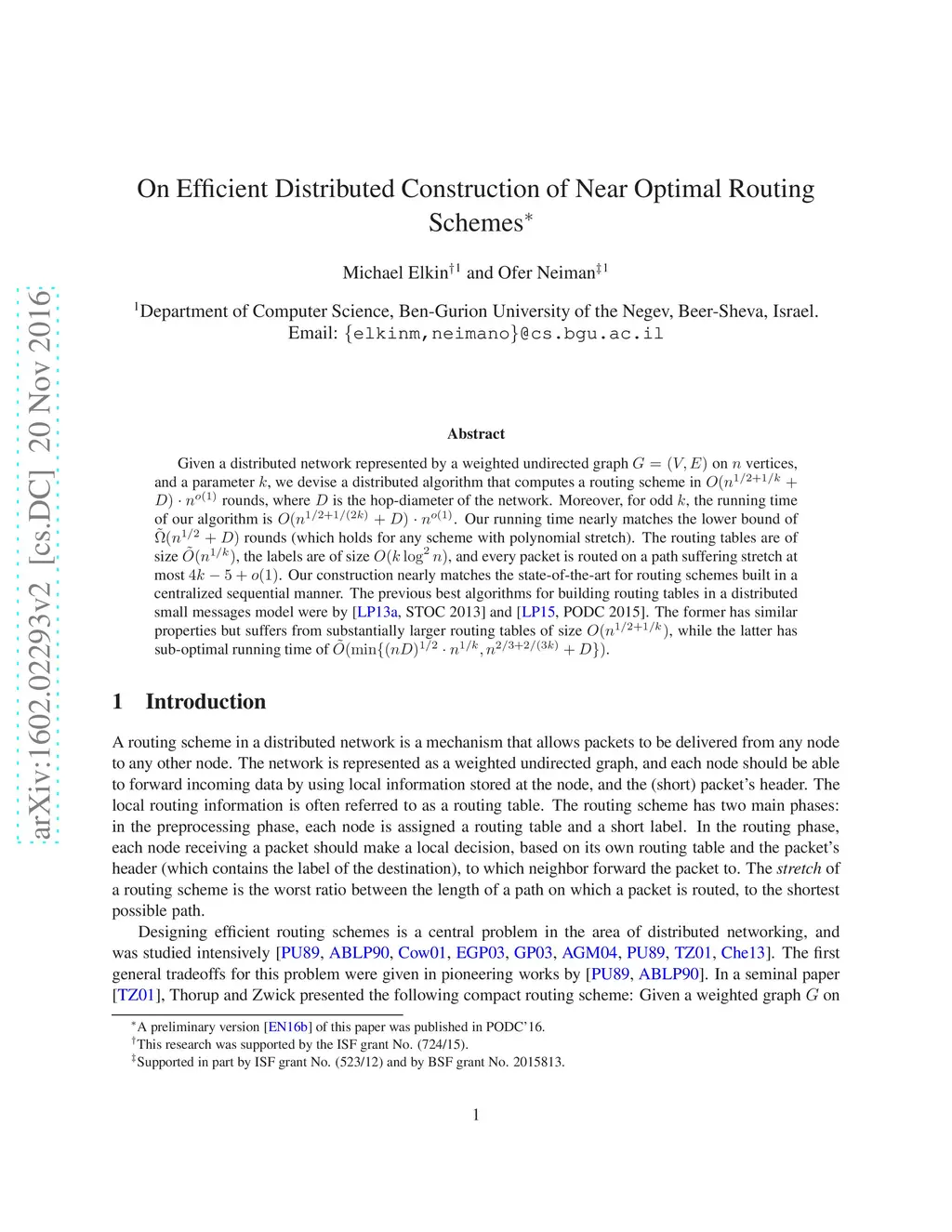 Given a distributed network represented by a weighted undirected graph on vertices, and a parameter , we devise a distributed algorithm that computes a routing scheme in rounds, where is the hop-diameter of the network. The running time matches the lower bound of rounds (which holds for any scheme with polynomial stretch), up to lower order terms. The routing tables are of size , the labels are of size , and every packet is routed on a path suffering stretch at most . Our construction nearly matches the state-of-the-art for routing schemes built in a centralized sequential manner. The previous best algorithms for building routing tables in a distributed small messages model were by \cite[STOC 2013]{LP13} and \cite[PODC 2015]{LP15}. The former has similar properties but suffers from substantially larger routing tables of size , while the latter has sub-optimal running time of .