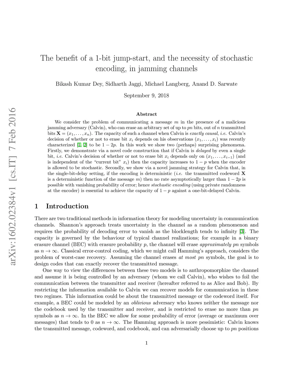 We consider the problem of communicating a message in the presence of a malicious jamming adversary (Calvin), who can erase an arbitrary set of up to bits, out of transmitted bits . The capacity of such a channel when Calvin is exactly causal, i.e. Calvin's decision of whether or not to erase bit depends on his observations was recently characterized to be . In this work we show two (perhaps) surprising phenomena. Firstly, we demonstrate via a novel code construction that if Calvin is delayed by even a single bit, i.e. Calvin's decision of whether or not to erase bit depends only on (and is independent of the "current bit" ) then the capacity increases to when the encoder is allowed to be stochastic. Secondly, we show via a novel jamming strategy for Calvin that, in the single-bit-delay setting, if the encoding is deterministic (i.e. the transmitted codeword is a deterministic function of the message ) then no rate asymptotically larger than is possible with vanishing probability of error, hence stochastic encoding (using private randomness at the encoder) is essential to achieve the capacity of against a one-bit-delayed Calvin.